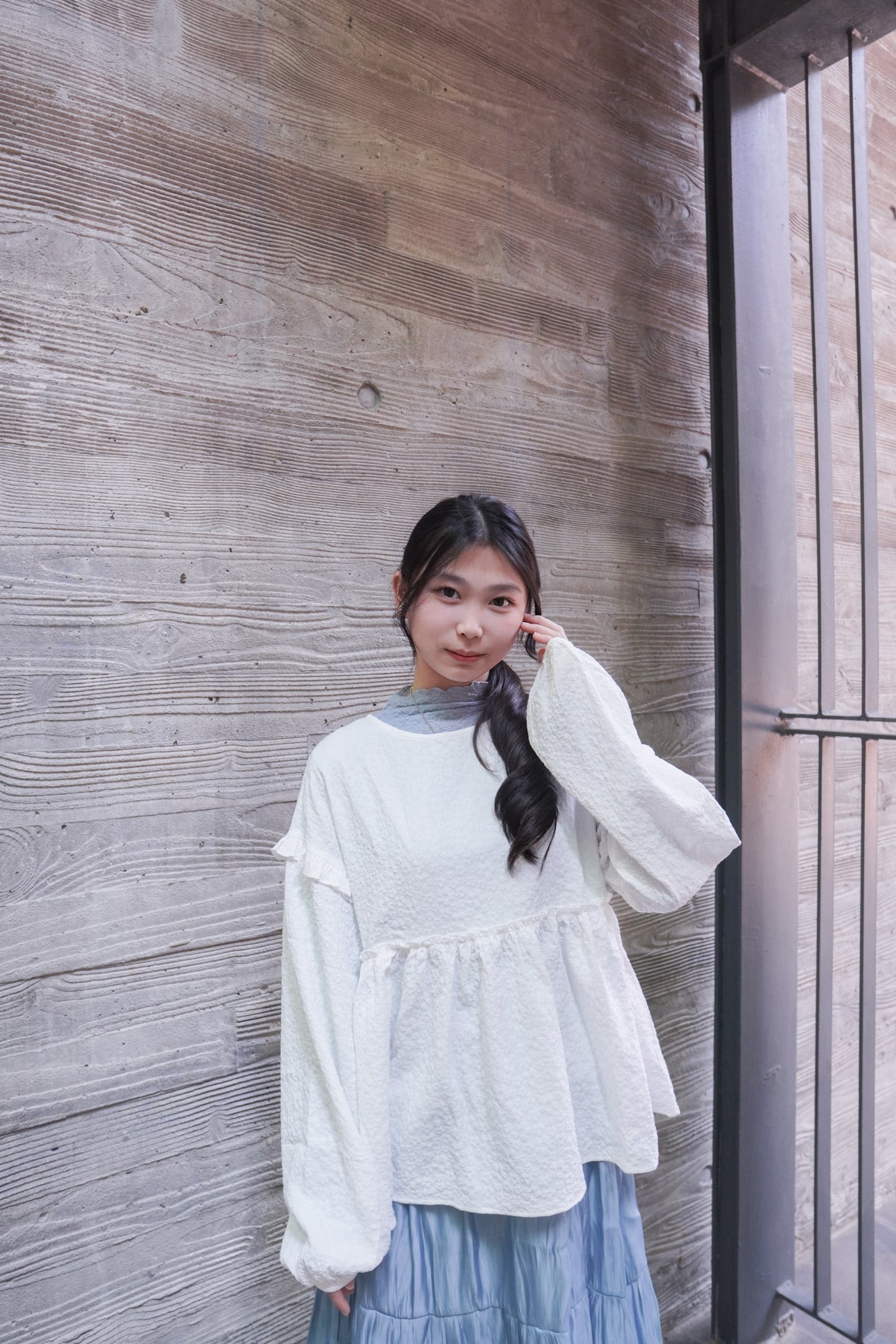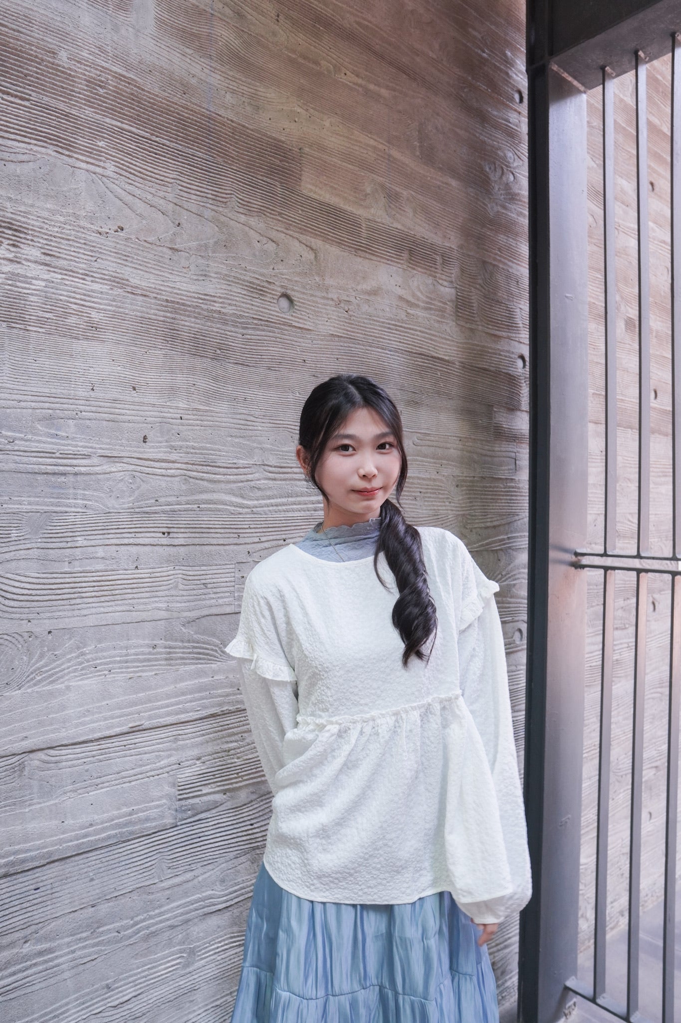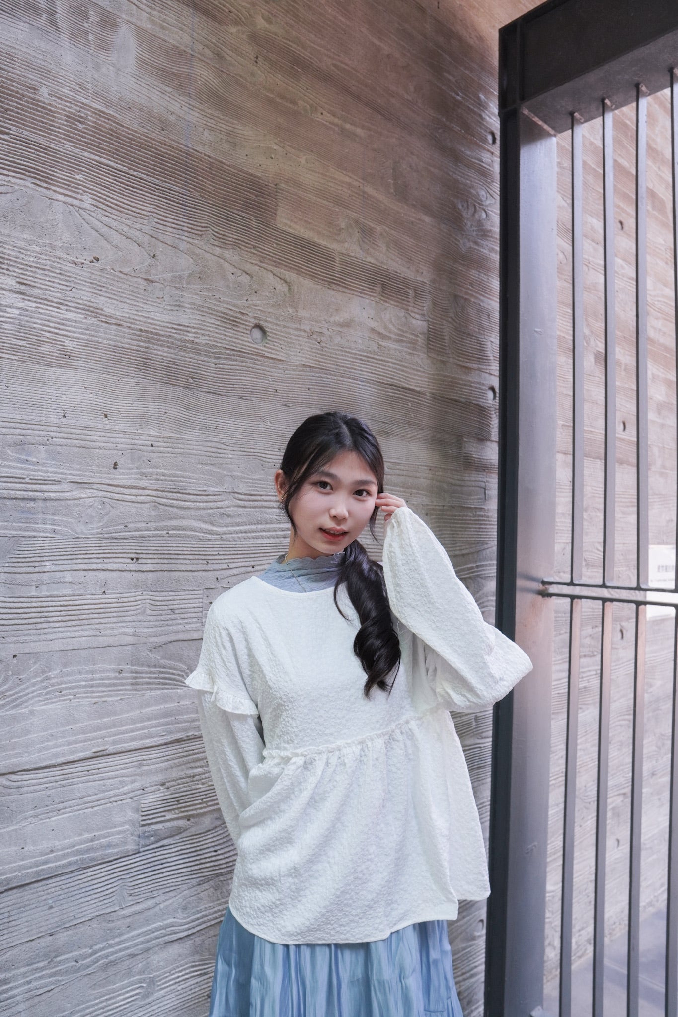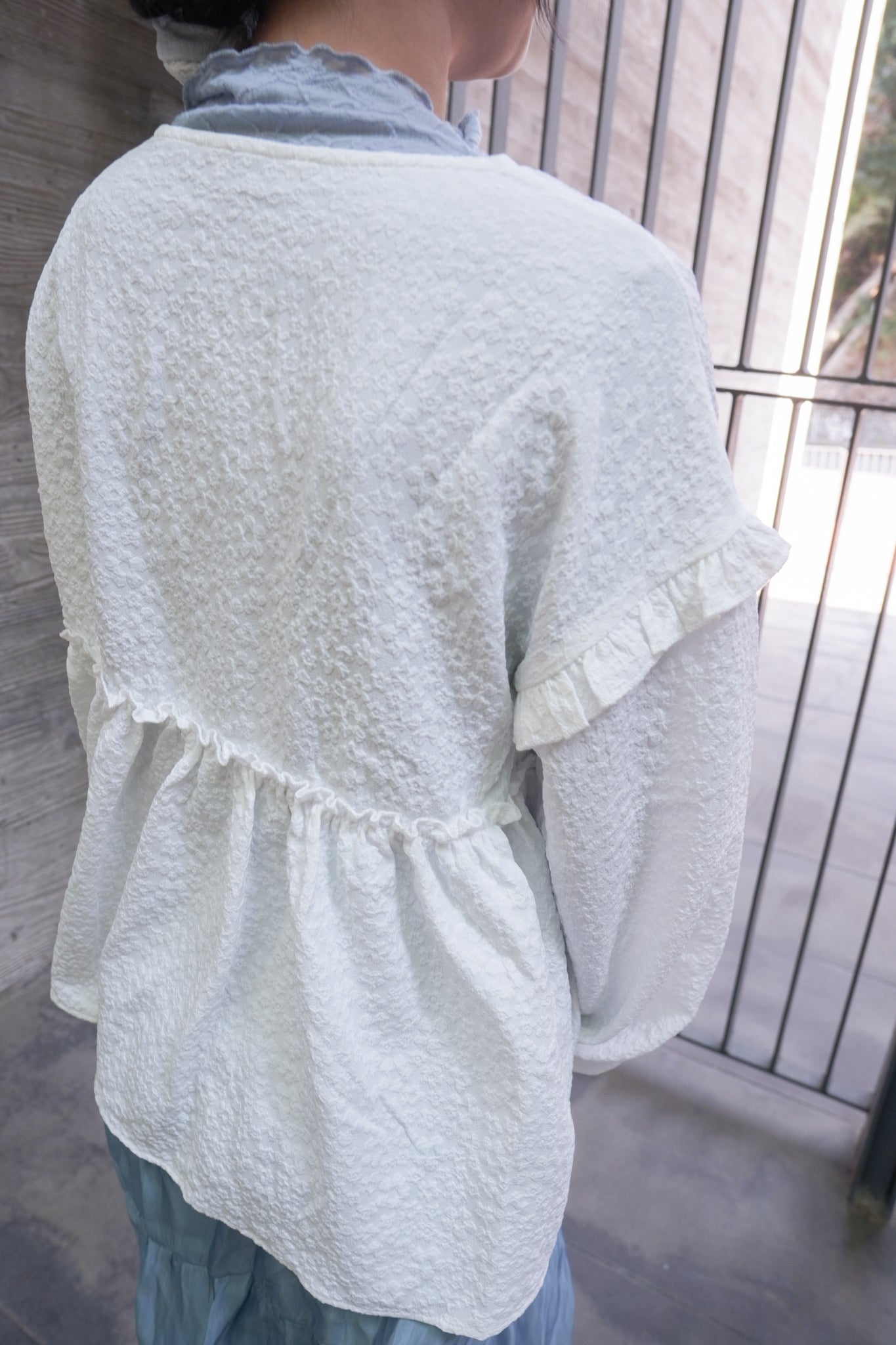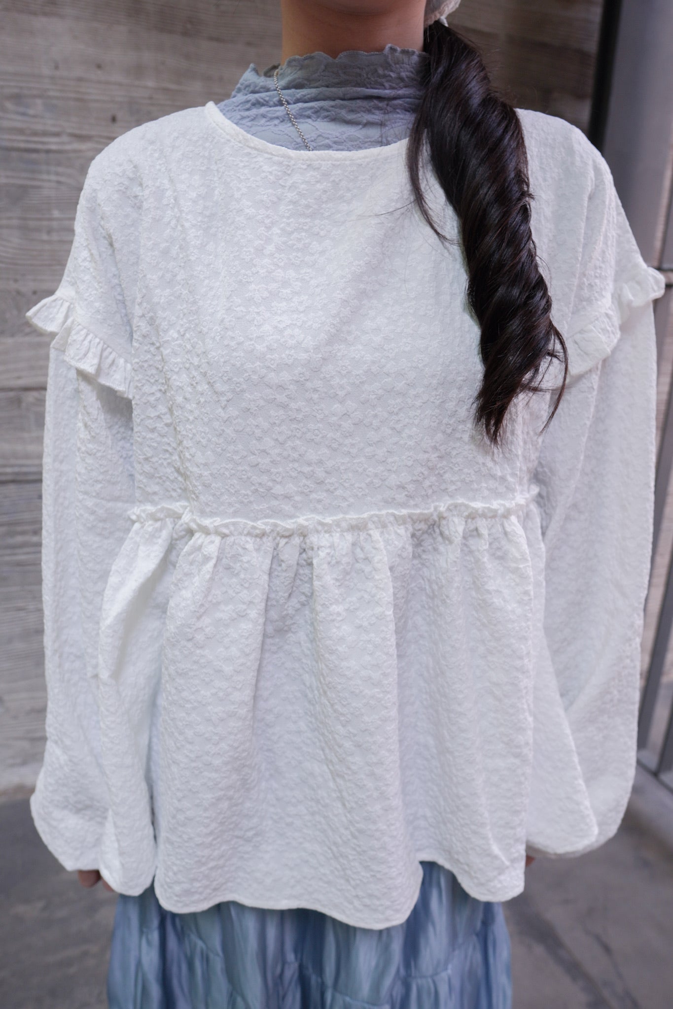 <現貨> 提花荷葉邊傘形圓領長袖上衣