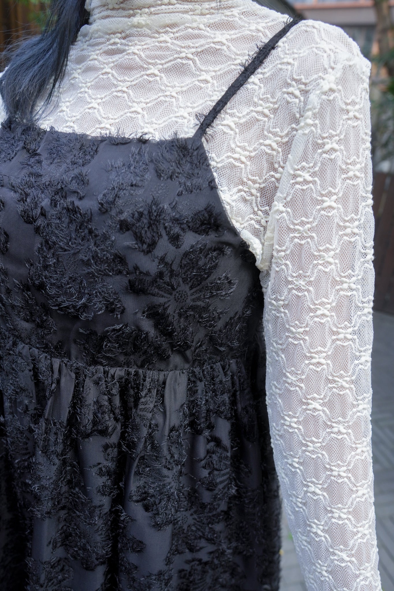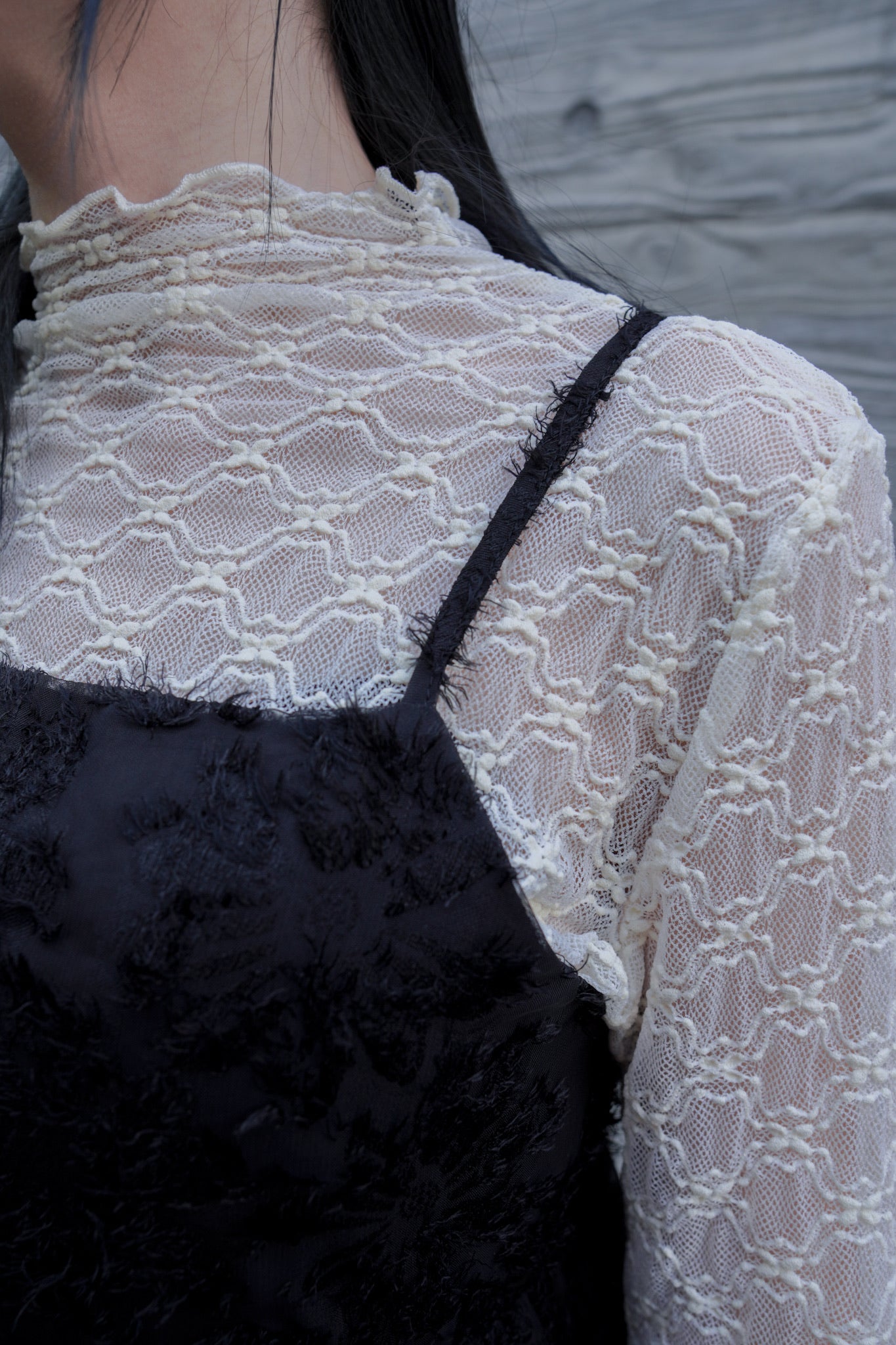 《 蕾絲提花透透高領長袖打底上衣 》
