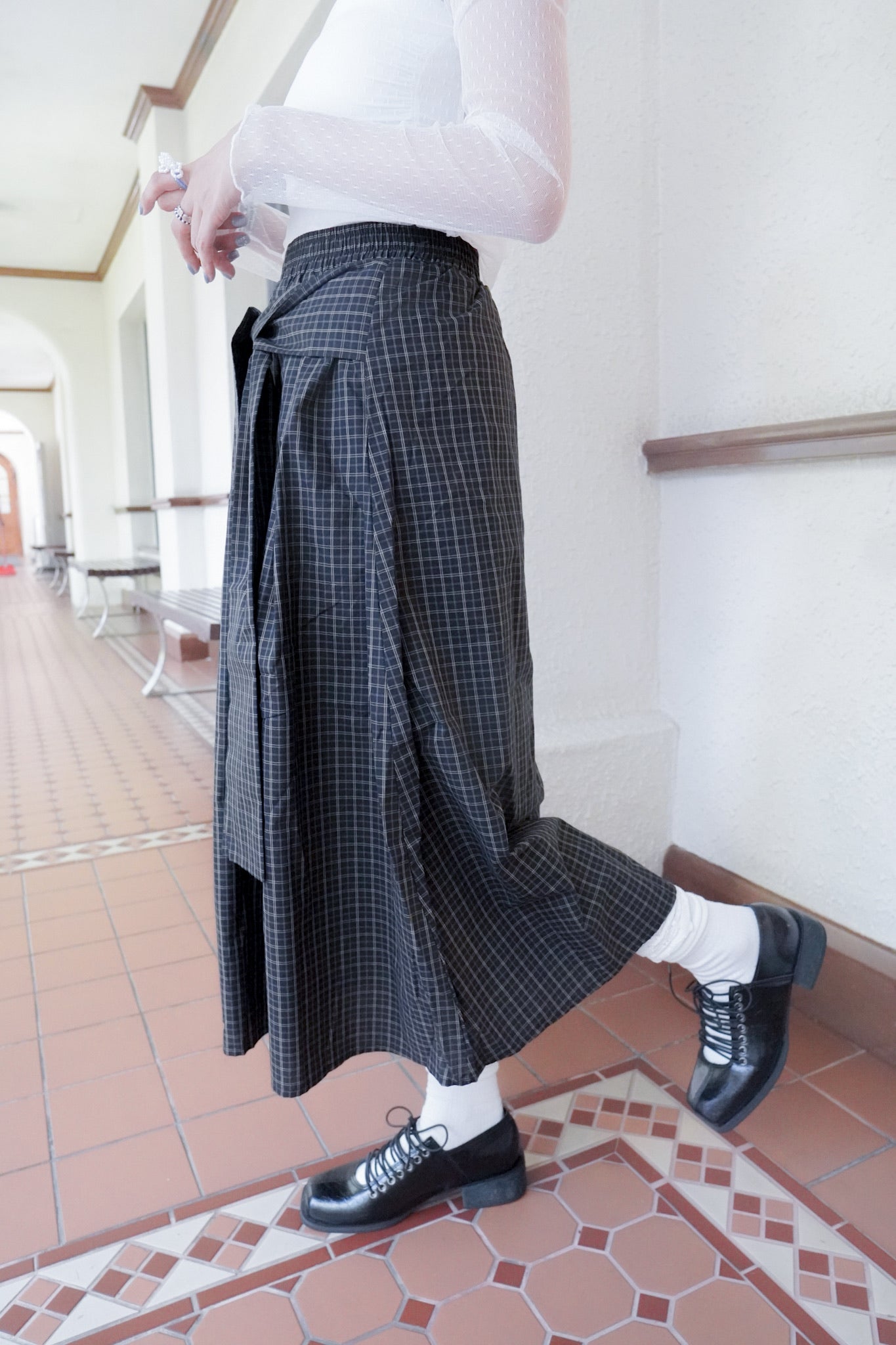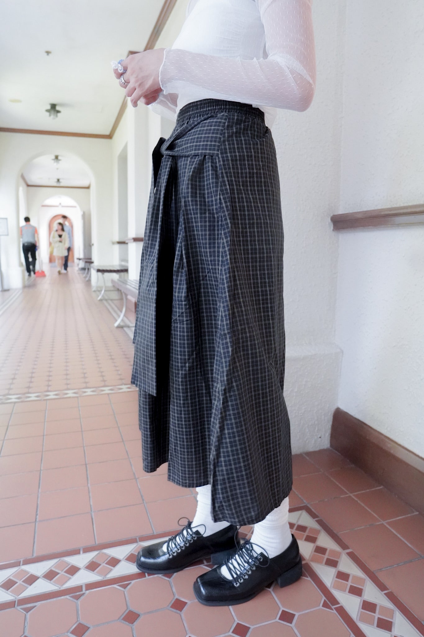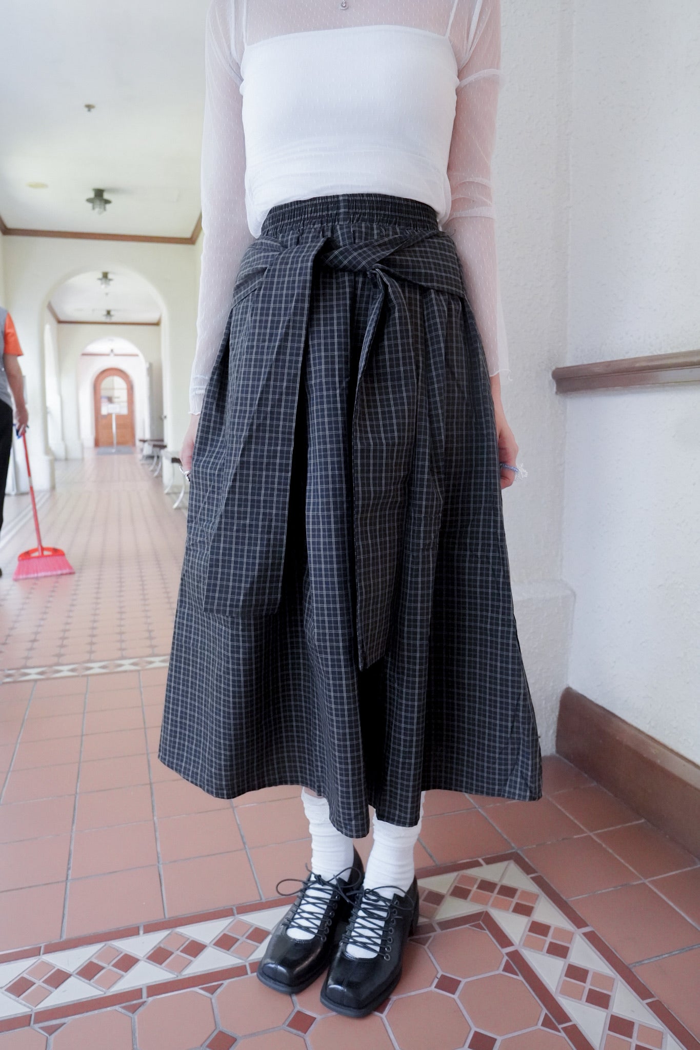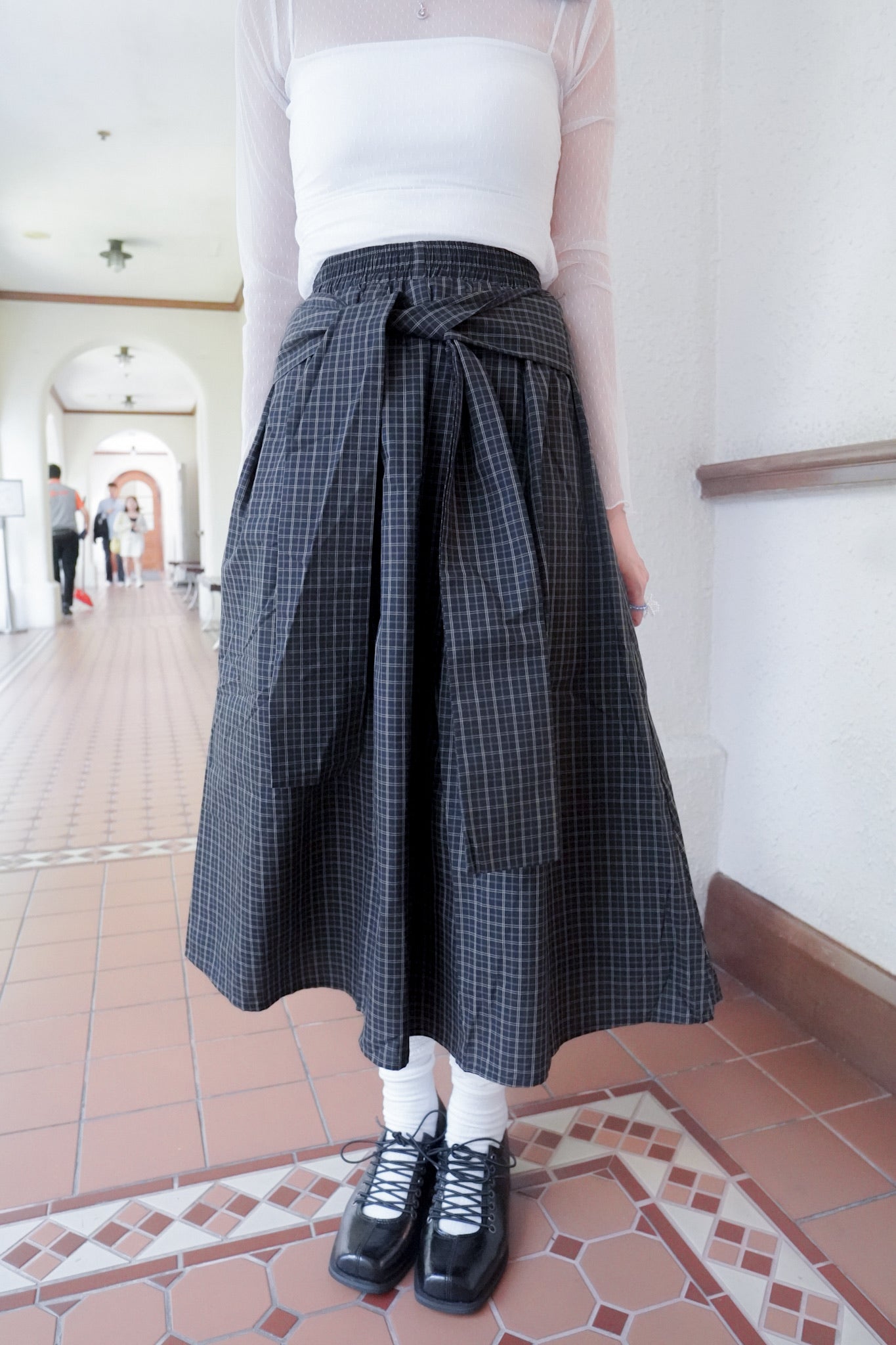 <現貨> 自家製 棉麻格紋綁帶半身長裙
