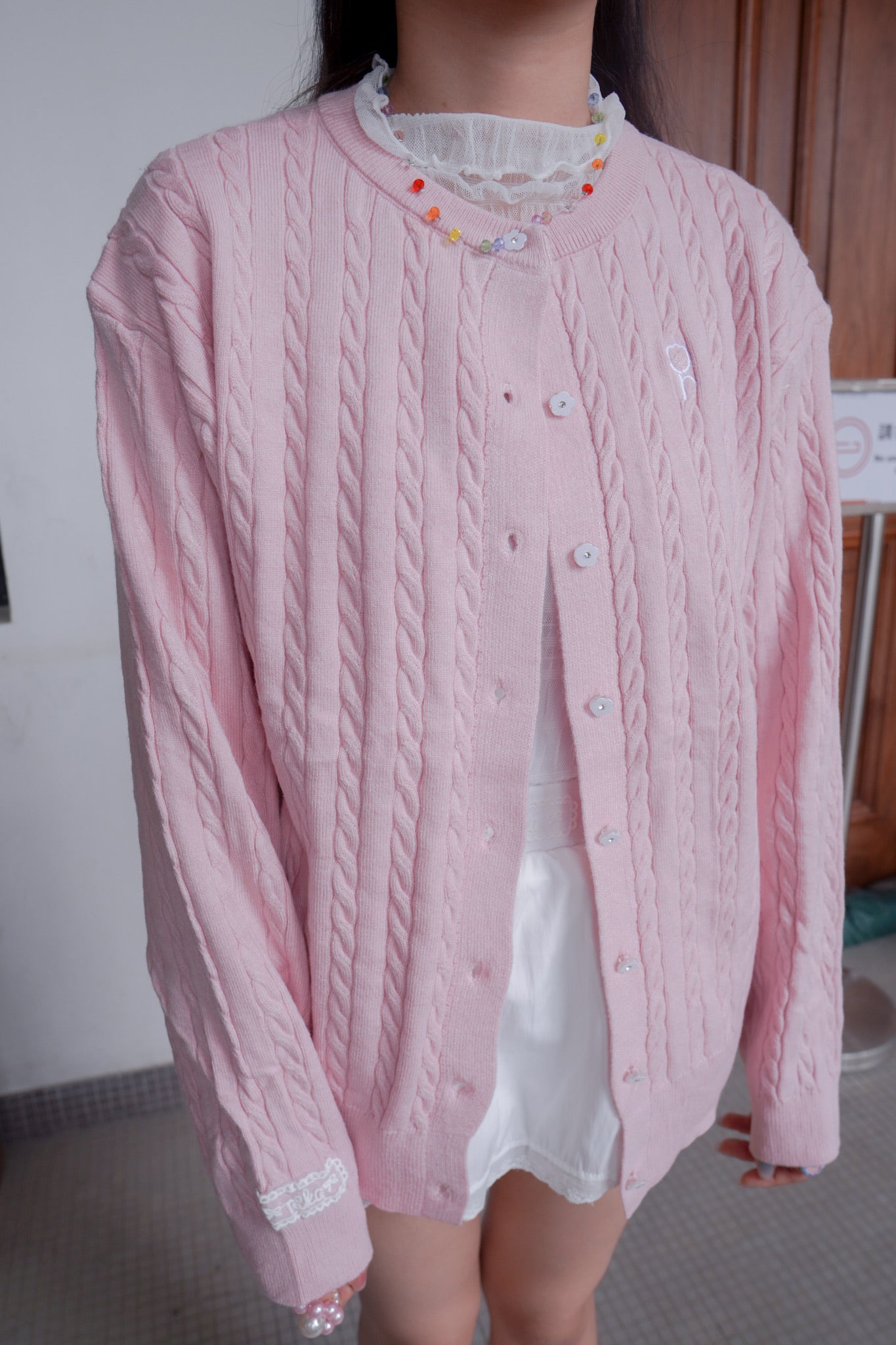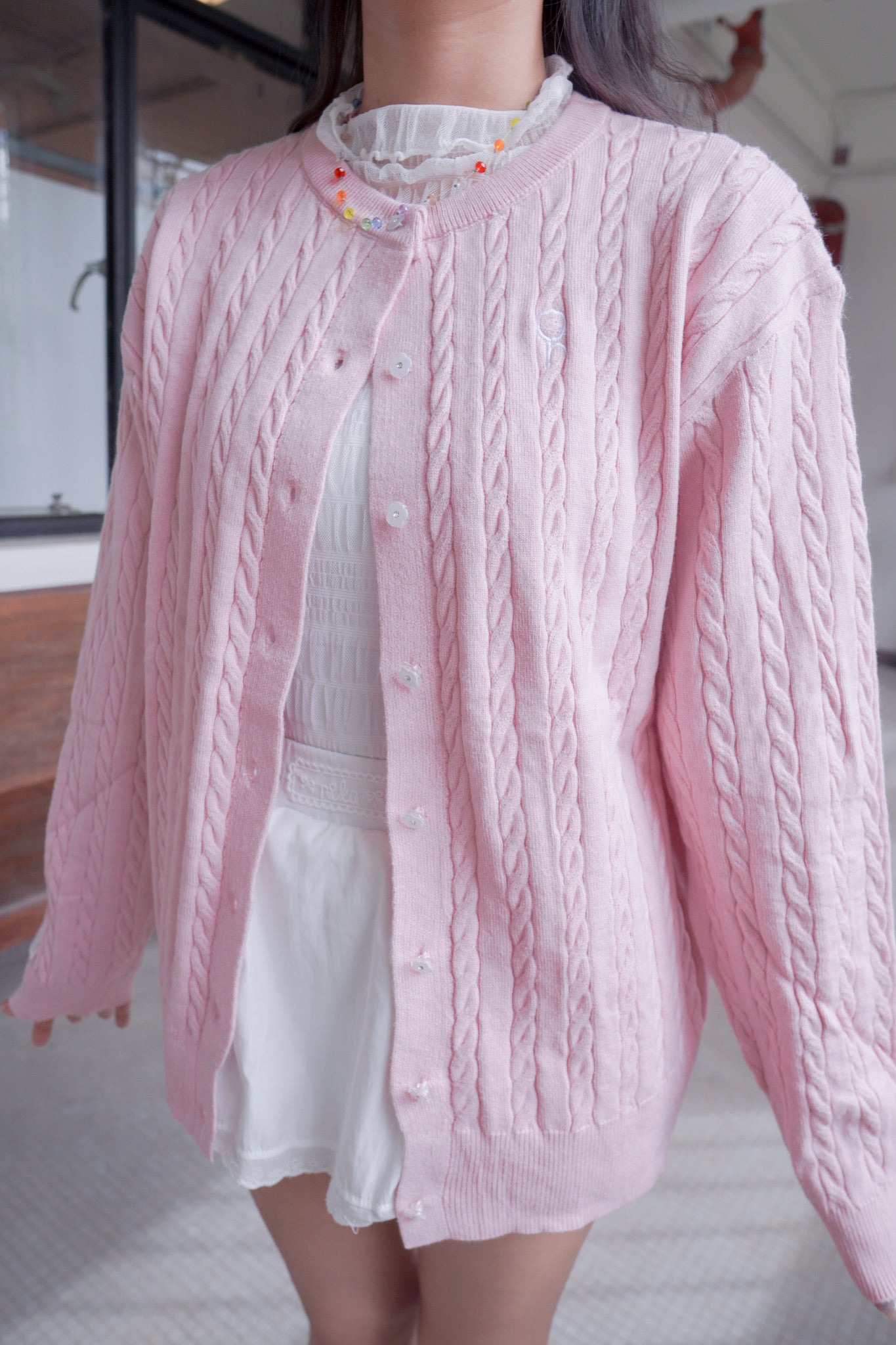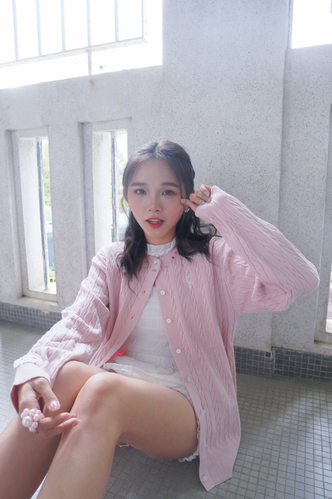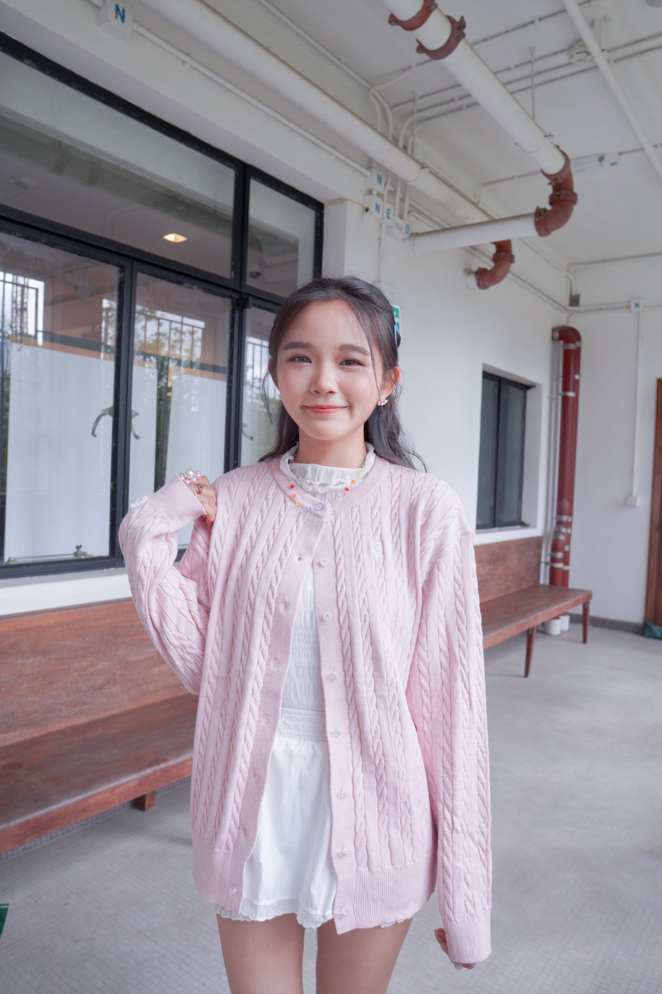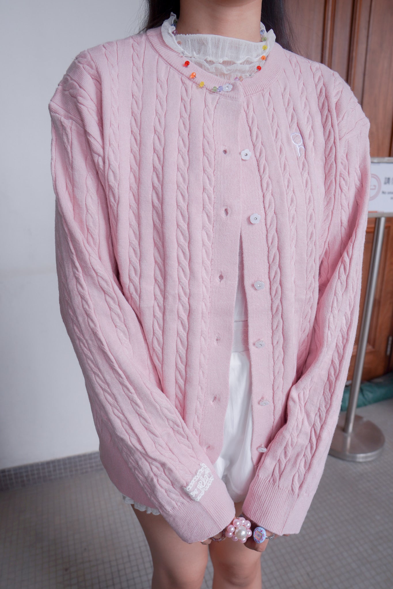 <現貨> 超可愛糖果色~棉花中長款花朵扣麻花開胸外套|淺粉