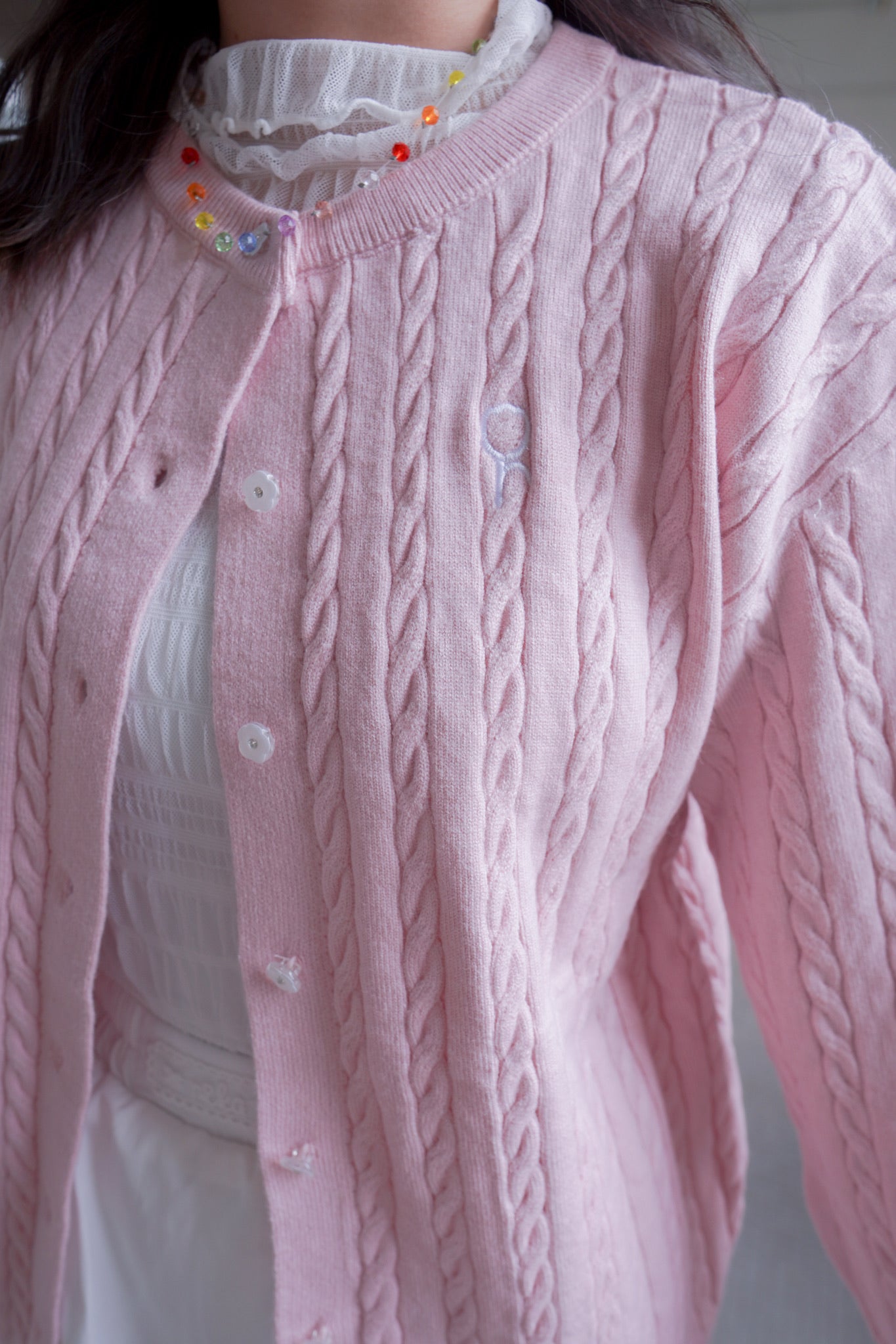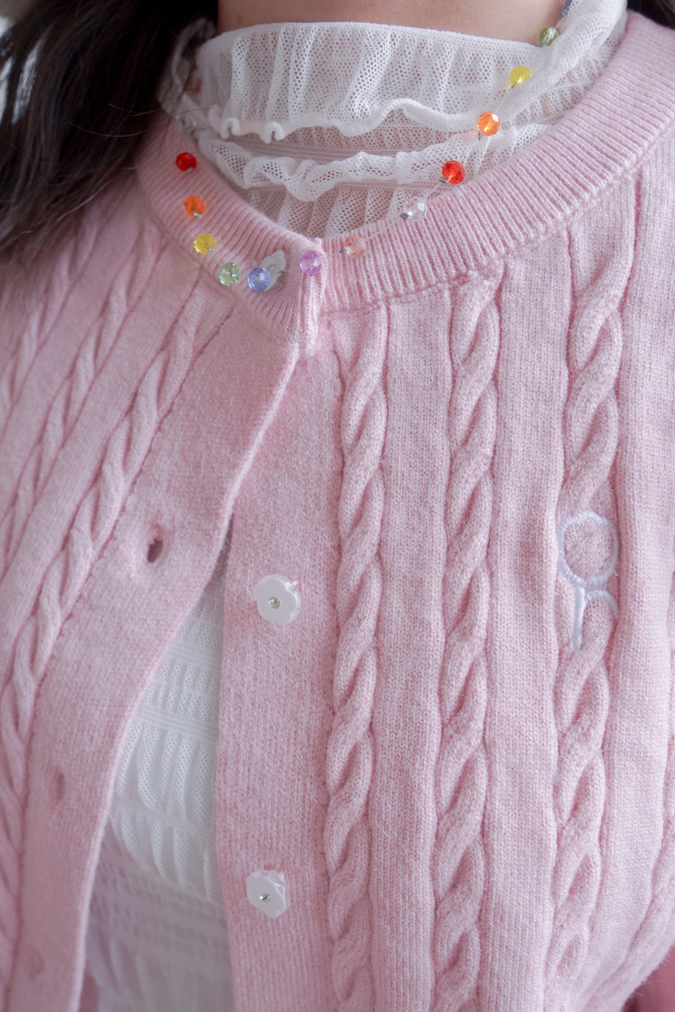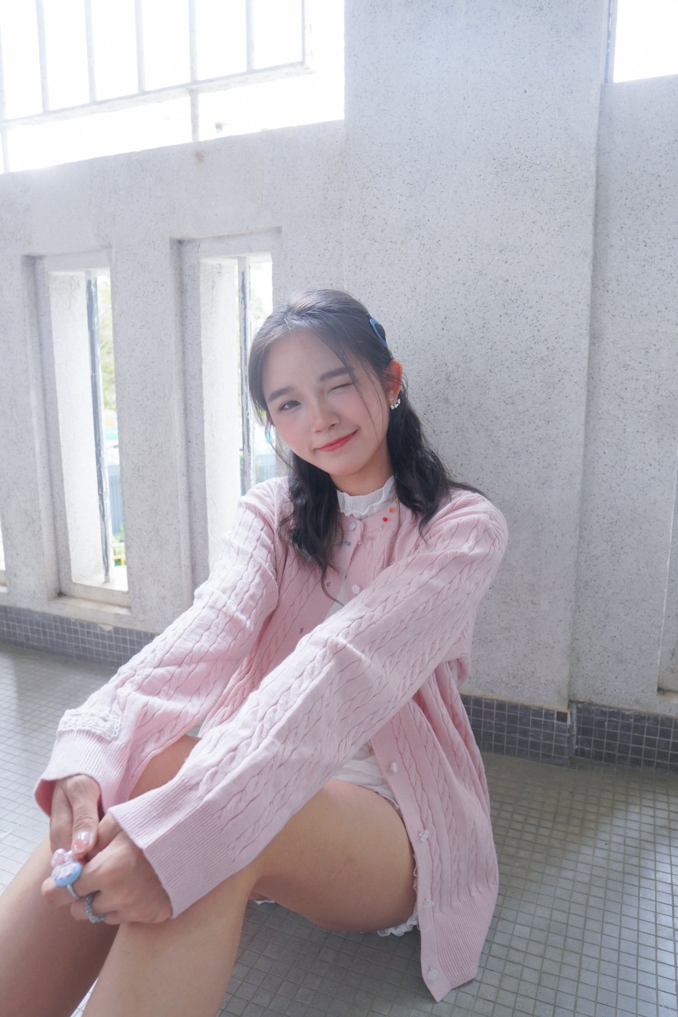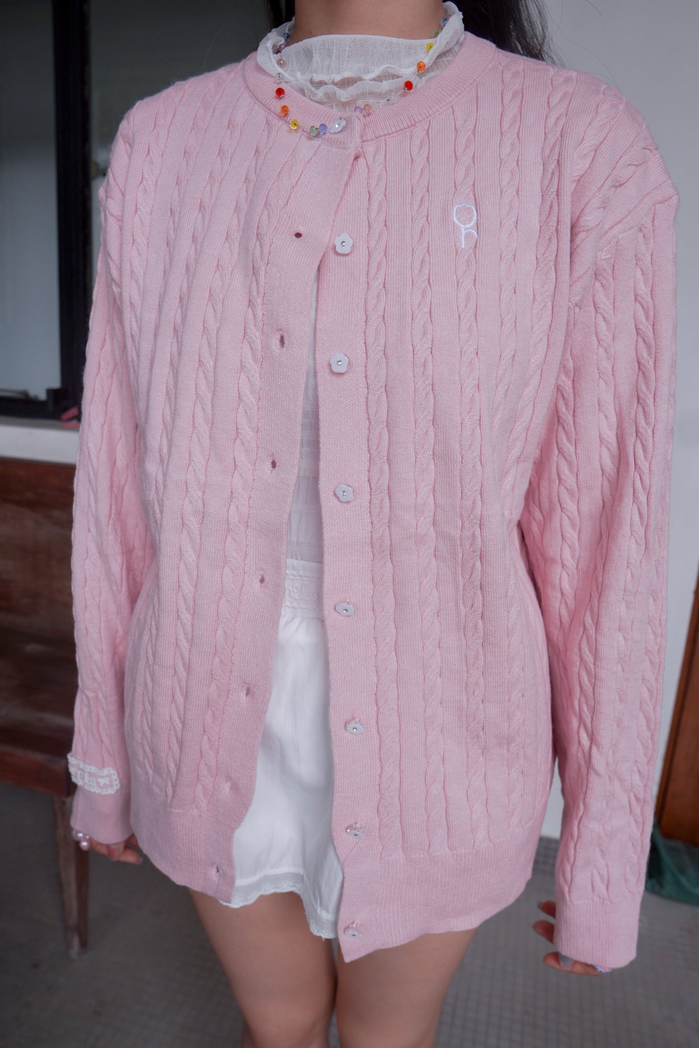 <現貨> 超可愛糖果色~棉花中長款花朵扣麻花開胸外套|淺粉