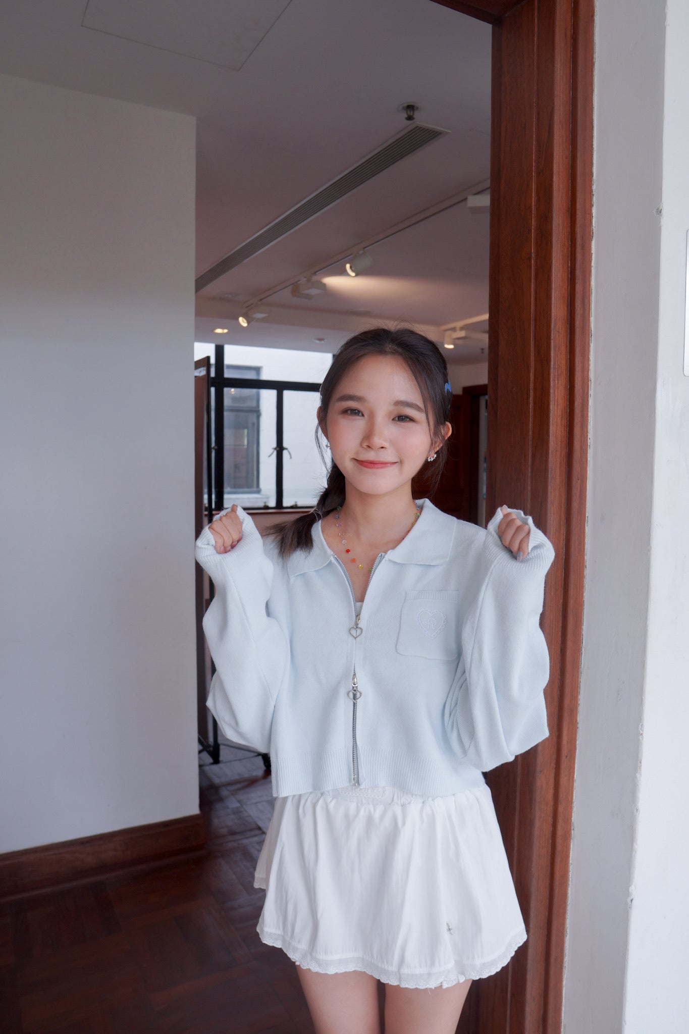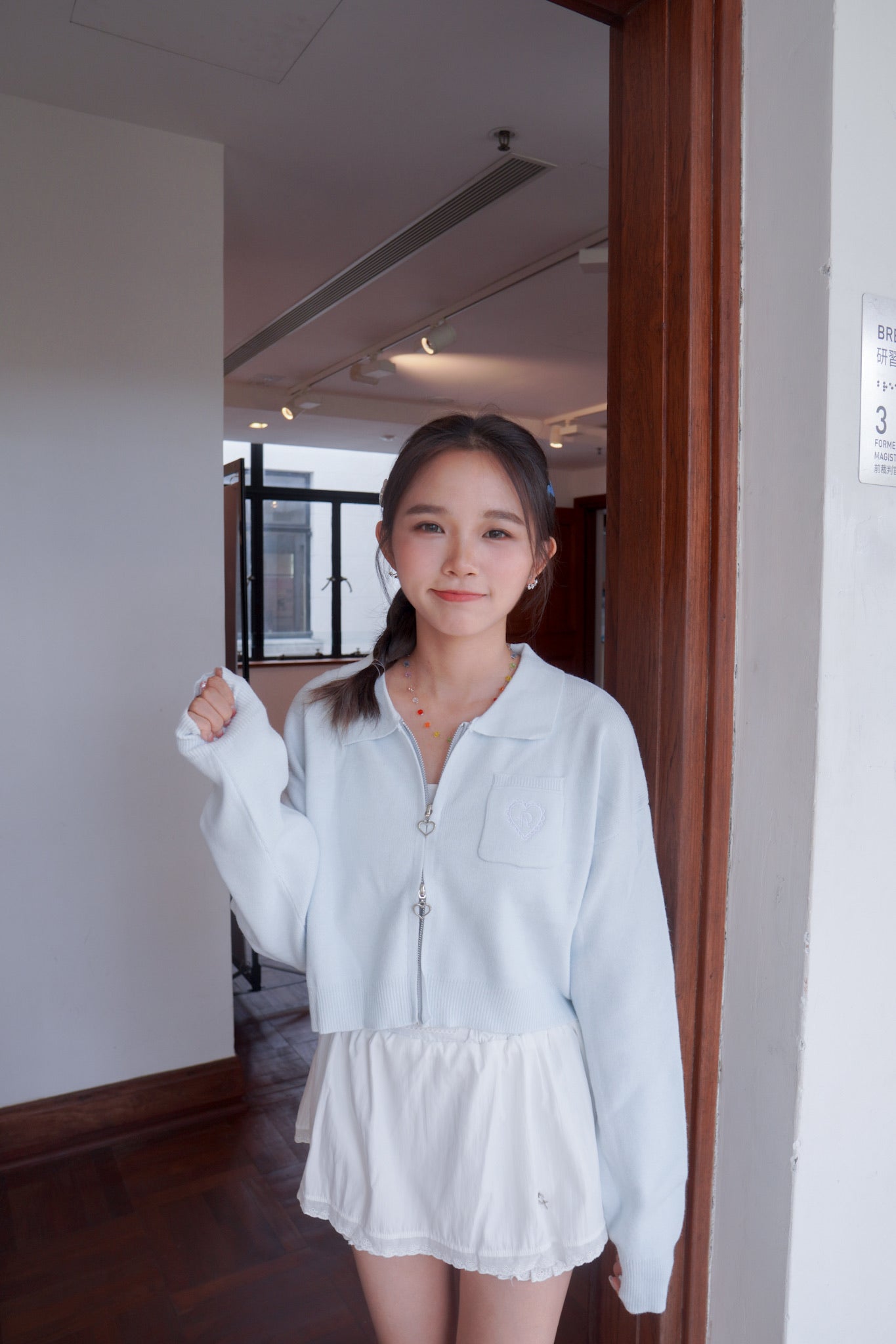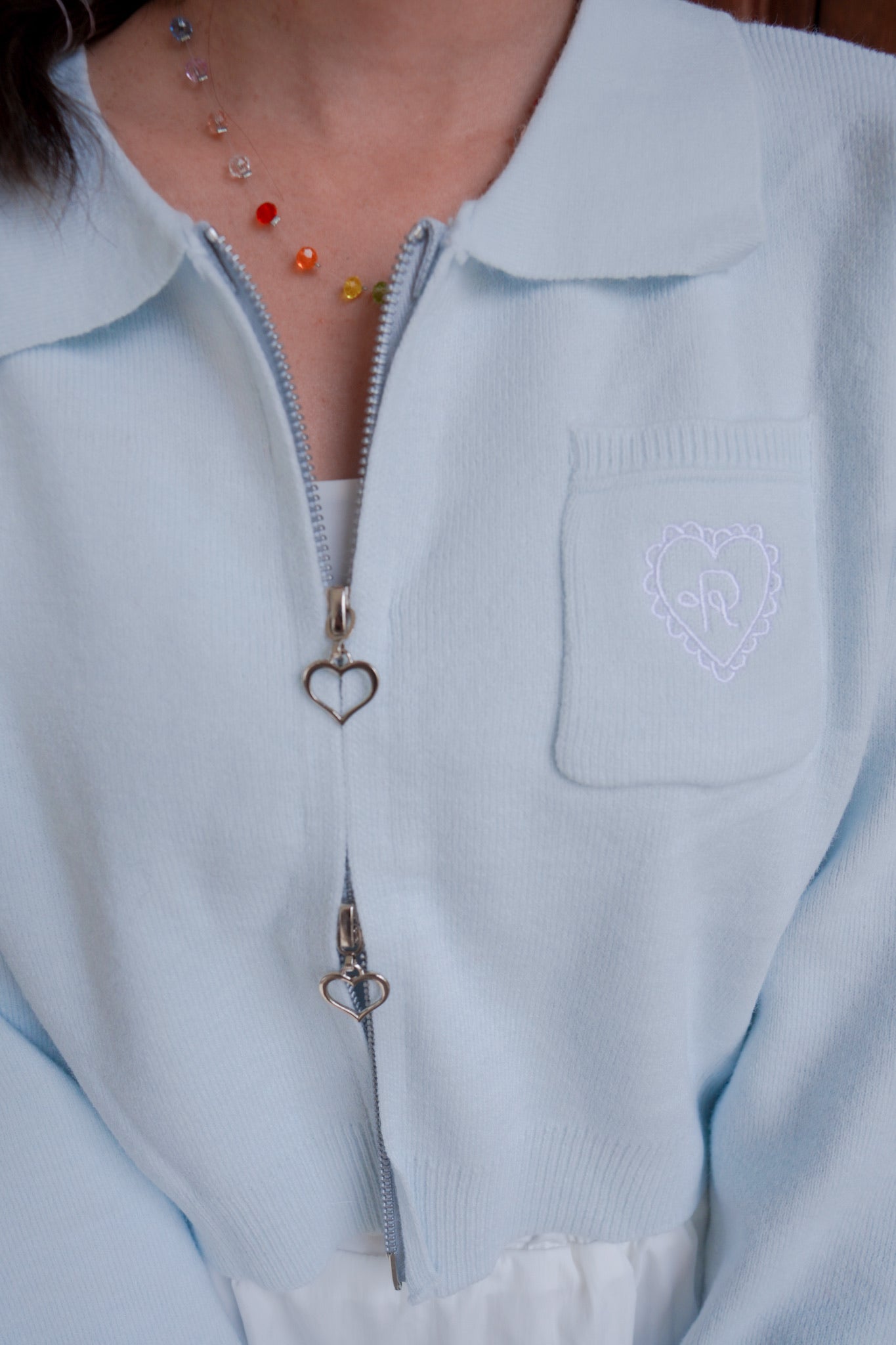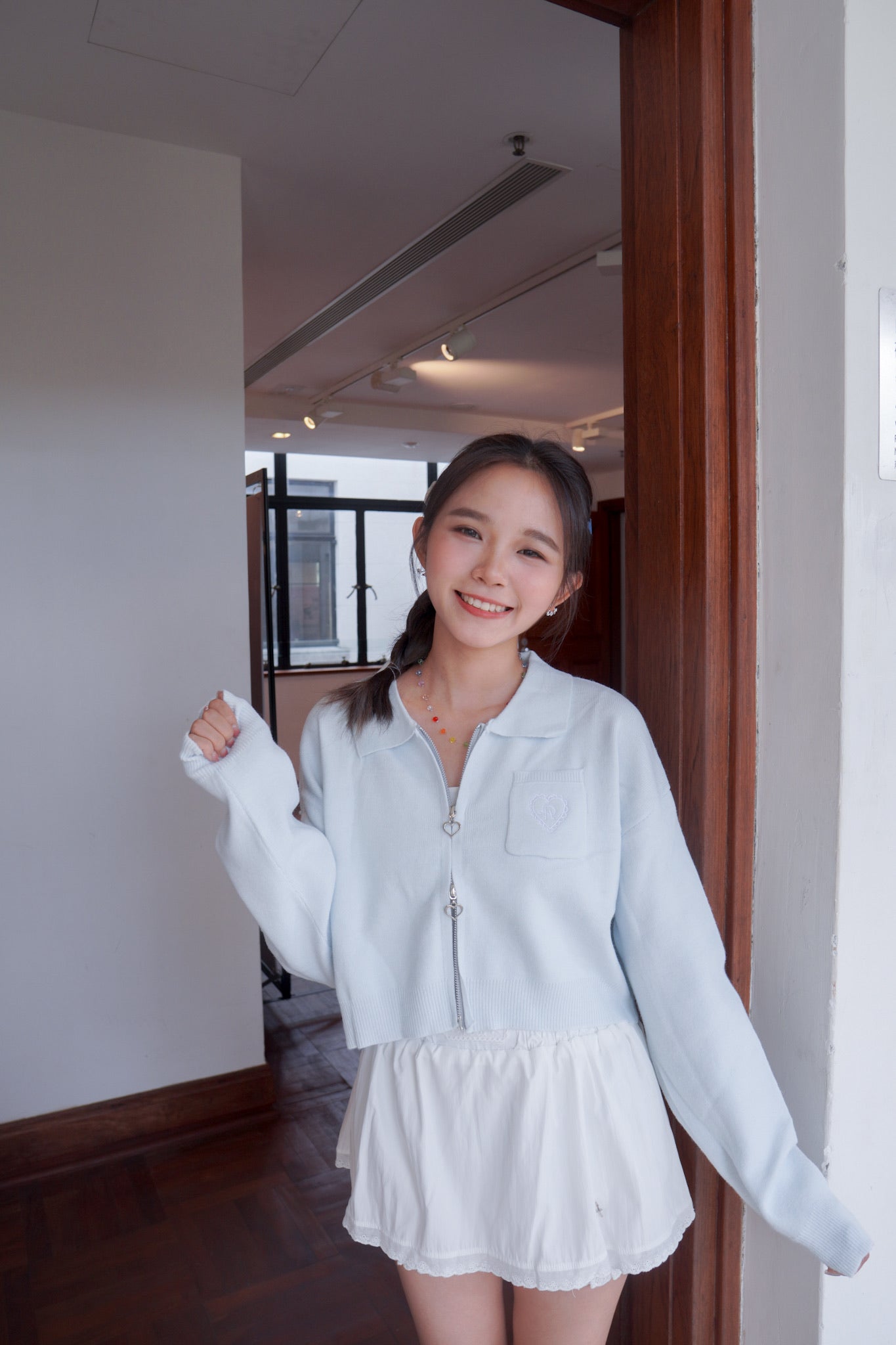 <預訂> 超可愛~馬卡龍愛心刺繡拉鍊口袋針織上衣|天藍