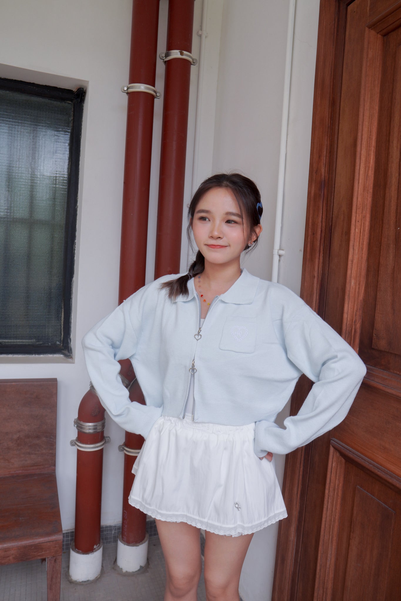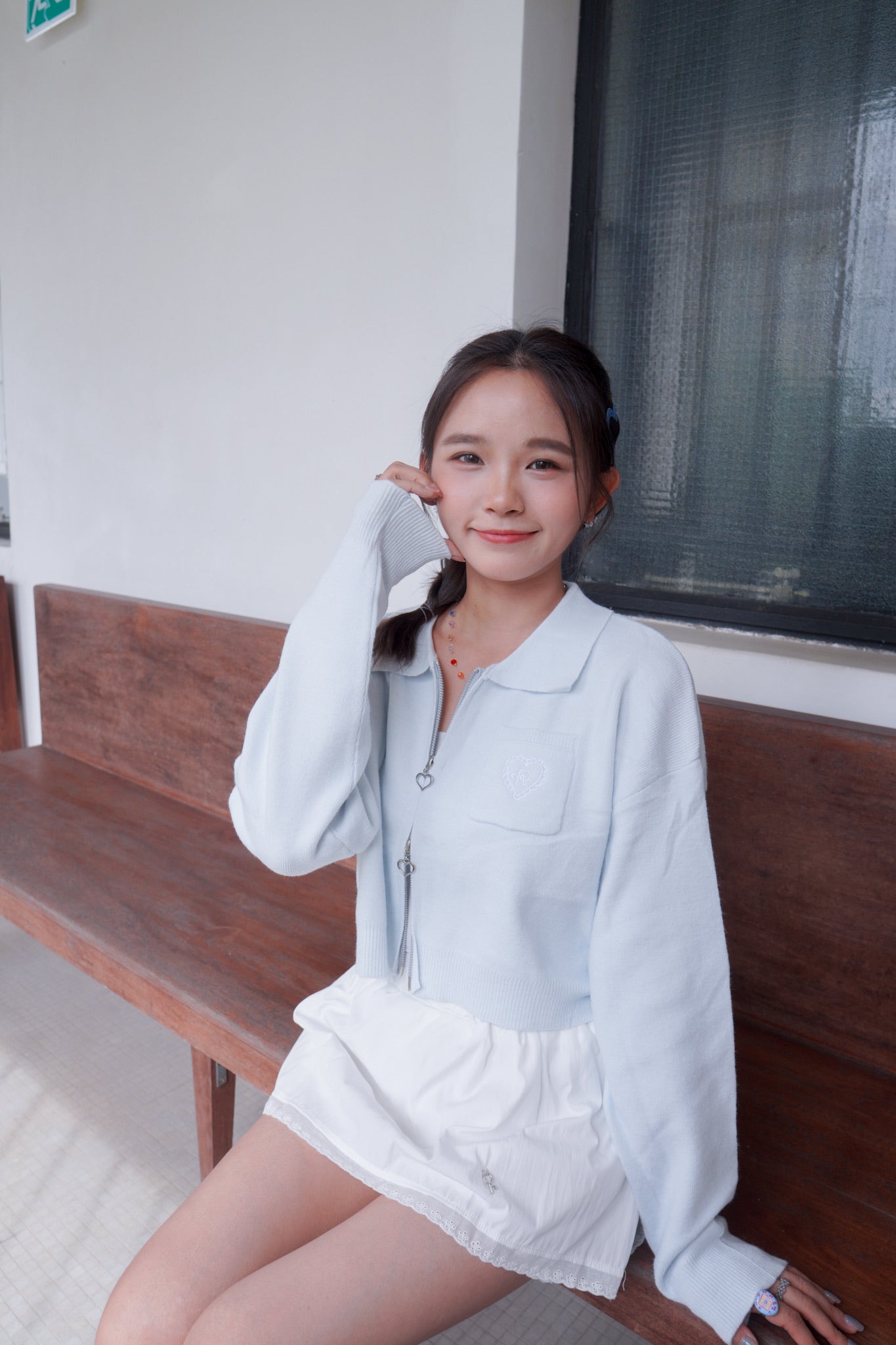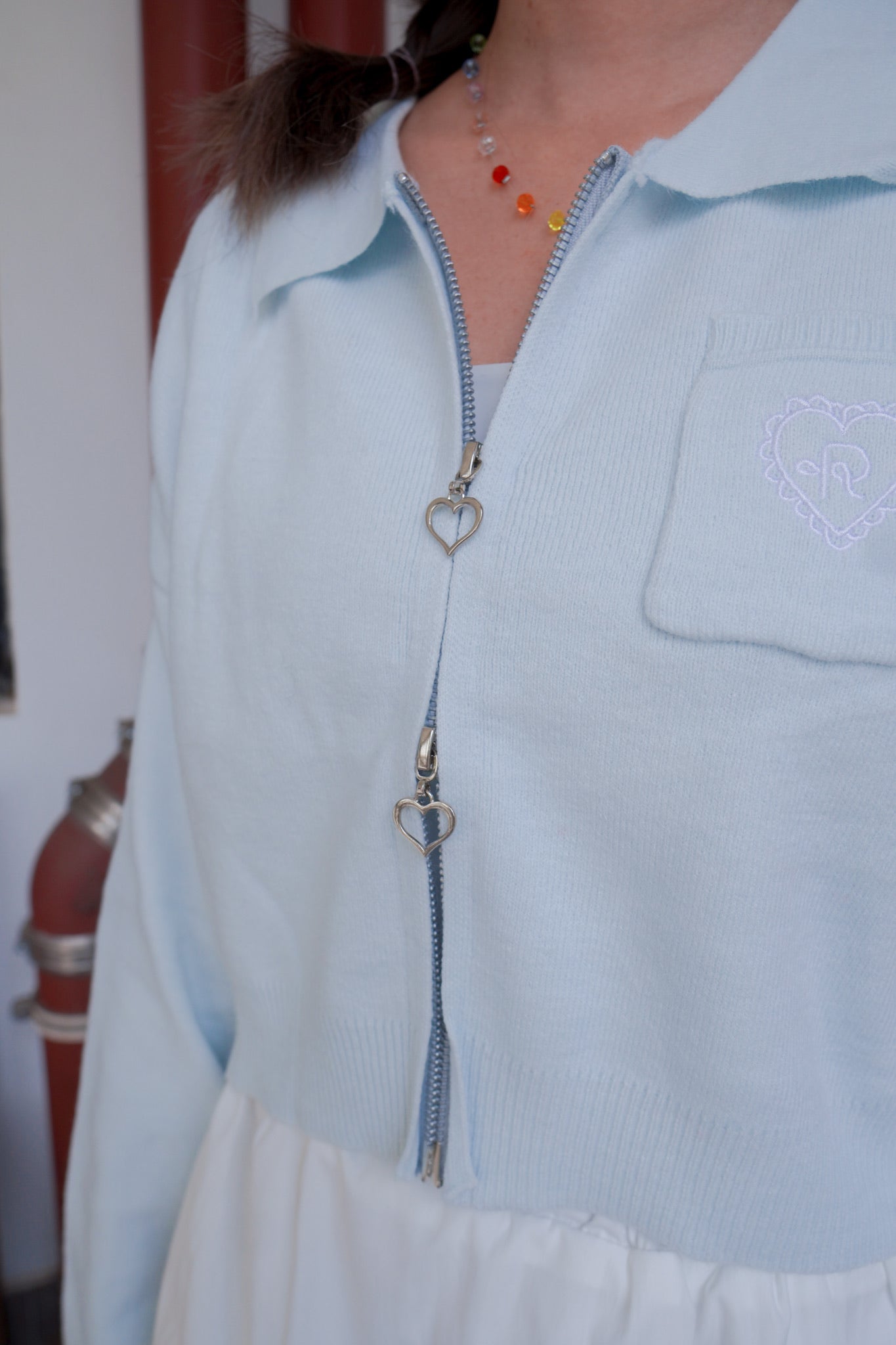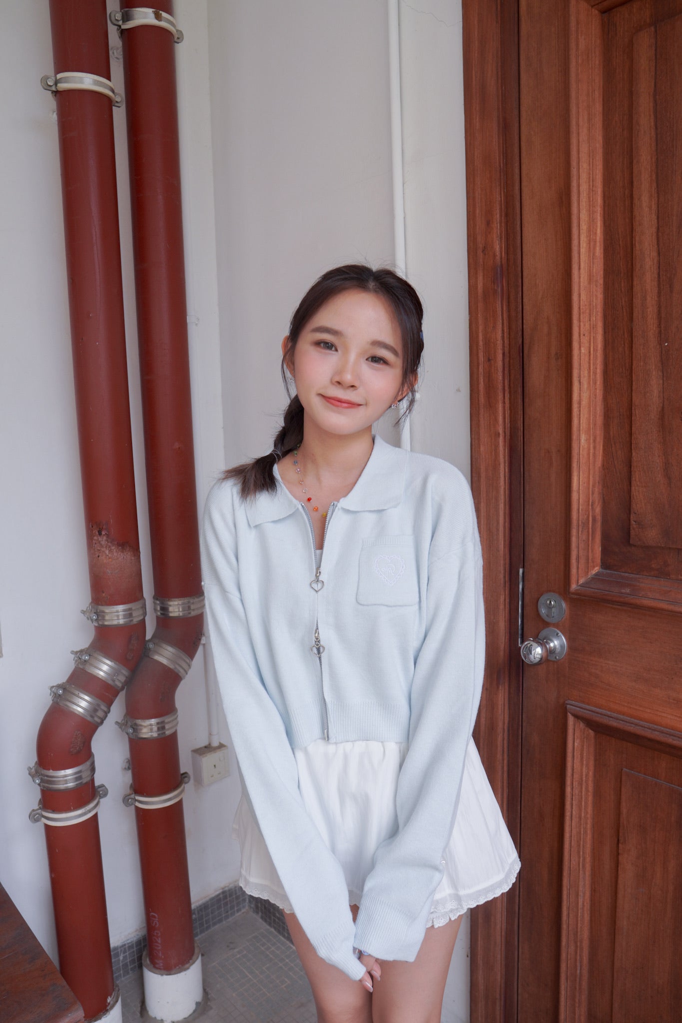 <預訂> 超可愛~馬卡龍愛心刺繡拉鍊口袋針織上衣|天藍