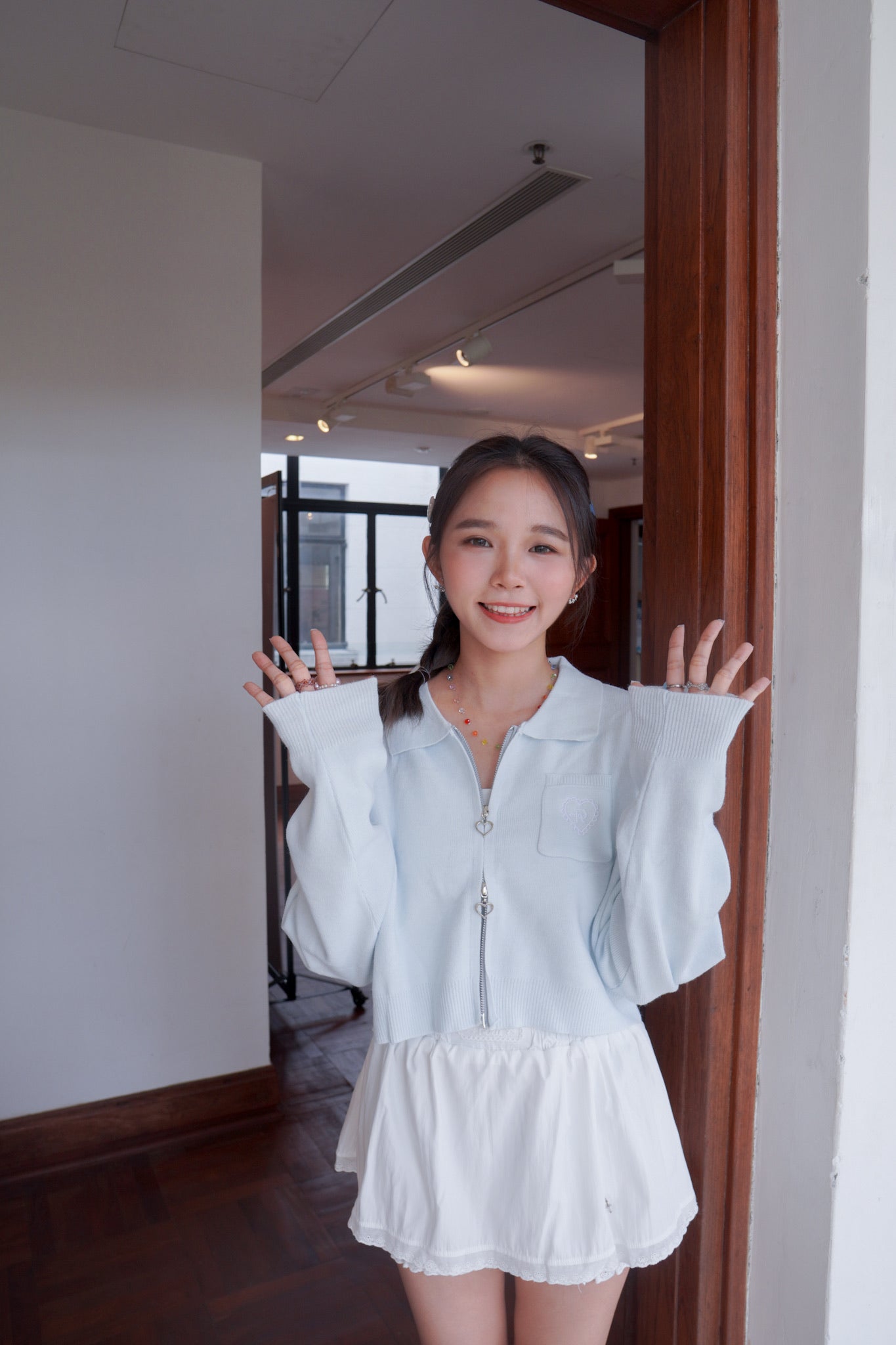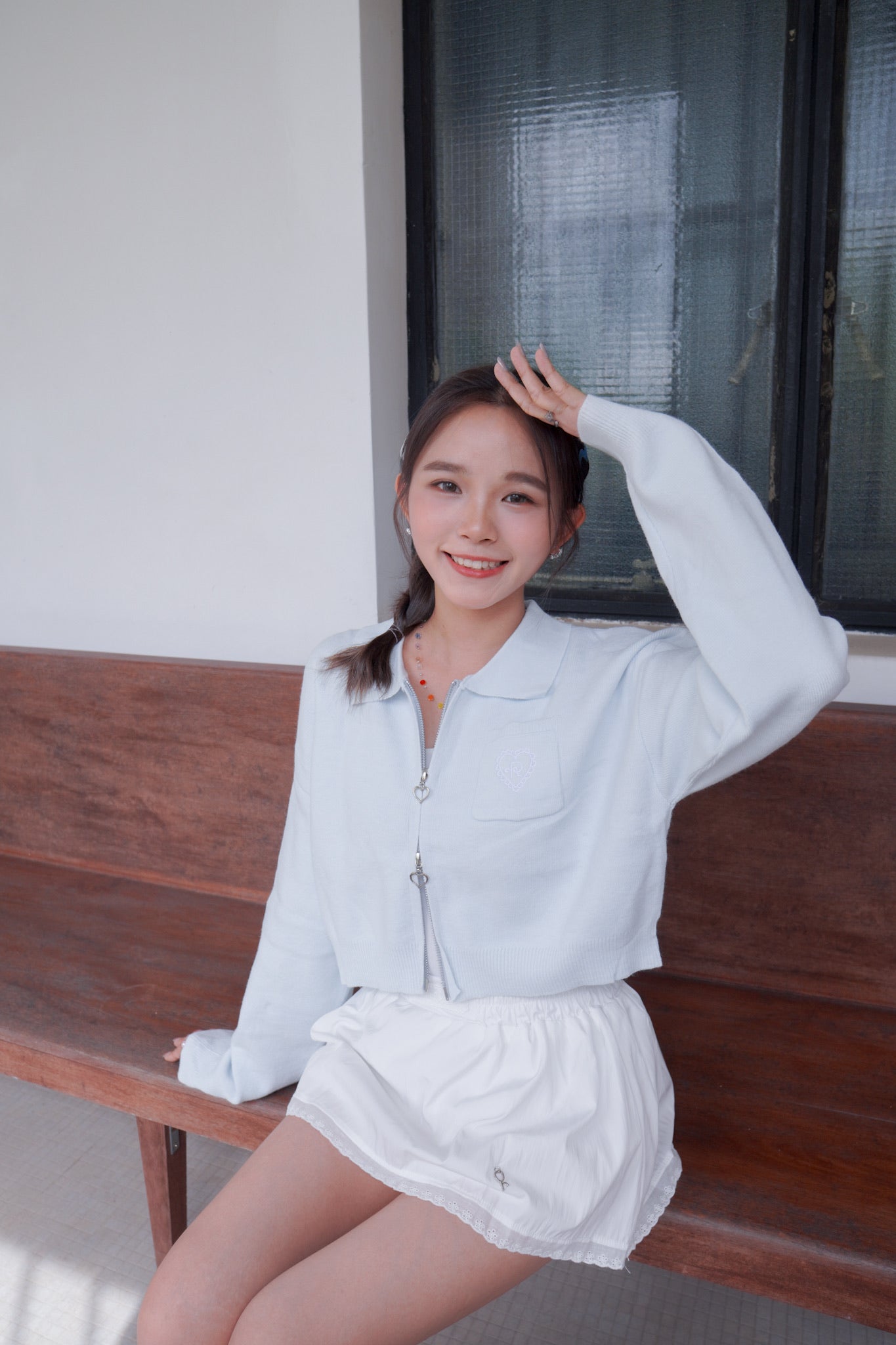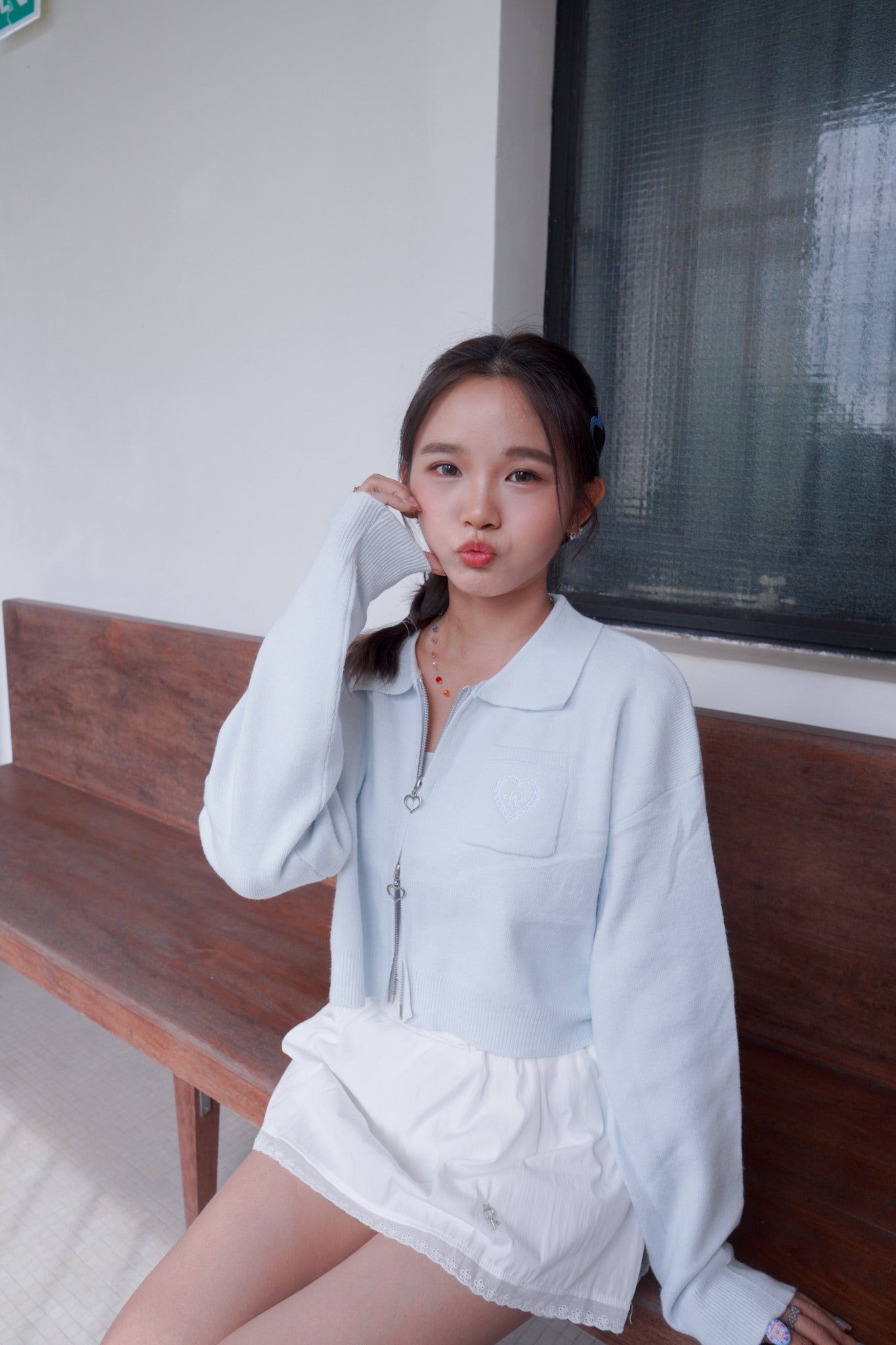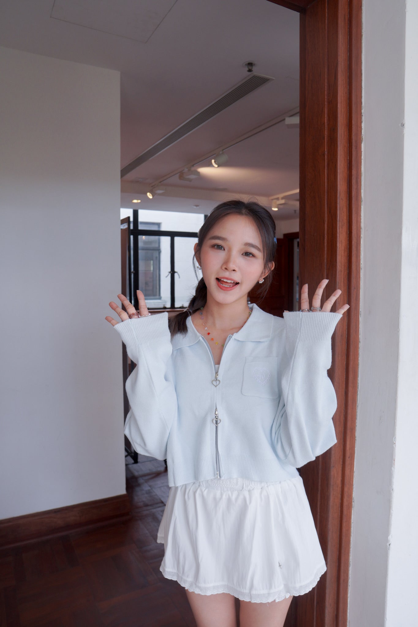 <預訂> 超可愛~馬卡龍愛心刺繡拉鍊口袋針織上衣|天藍