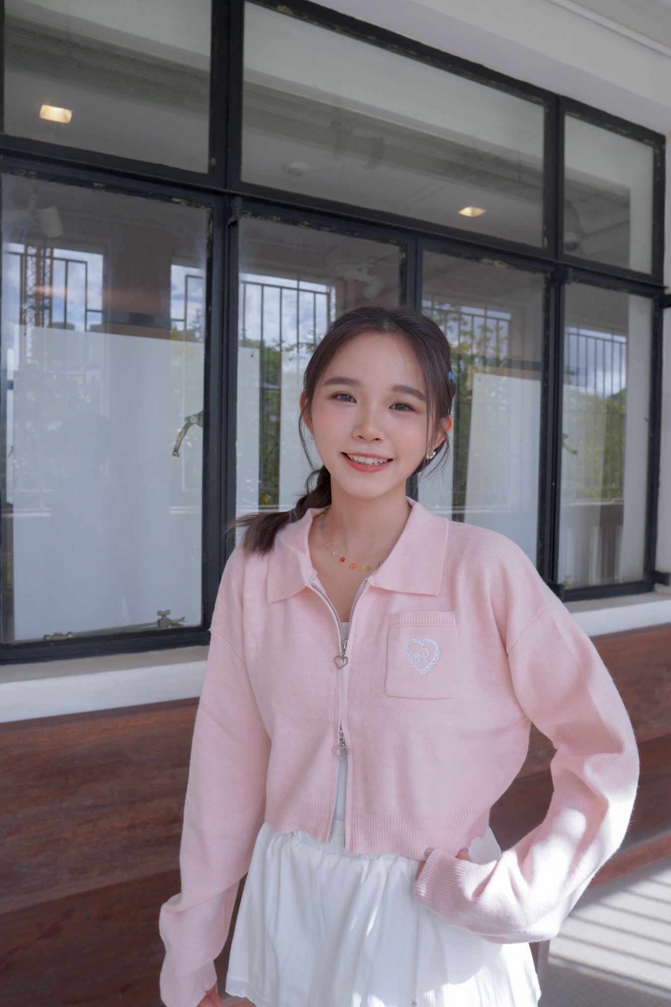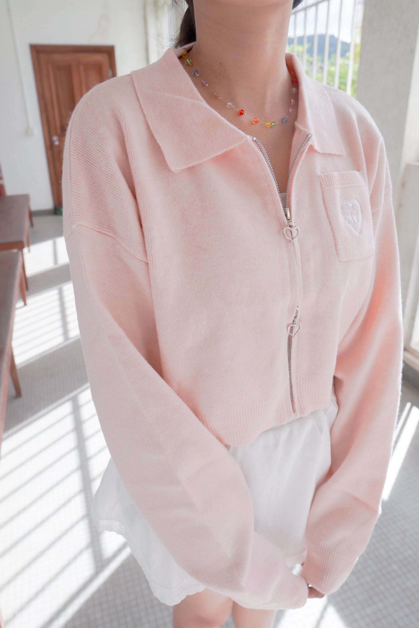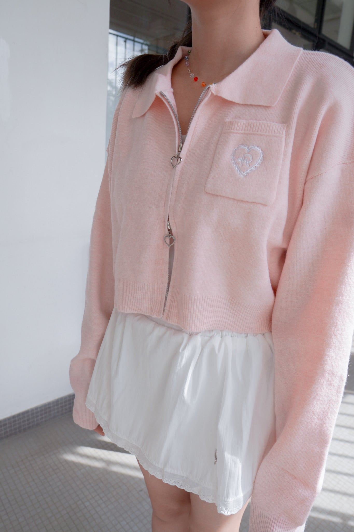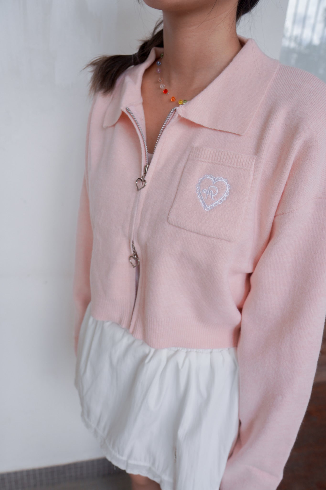 <現貨> 超可愛~馬卡龍愛心刺繡拉鍊口袋針織上衣|淺粉