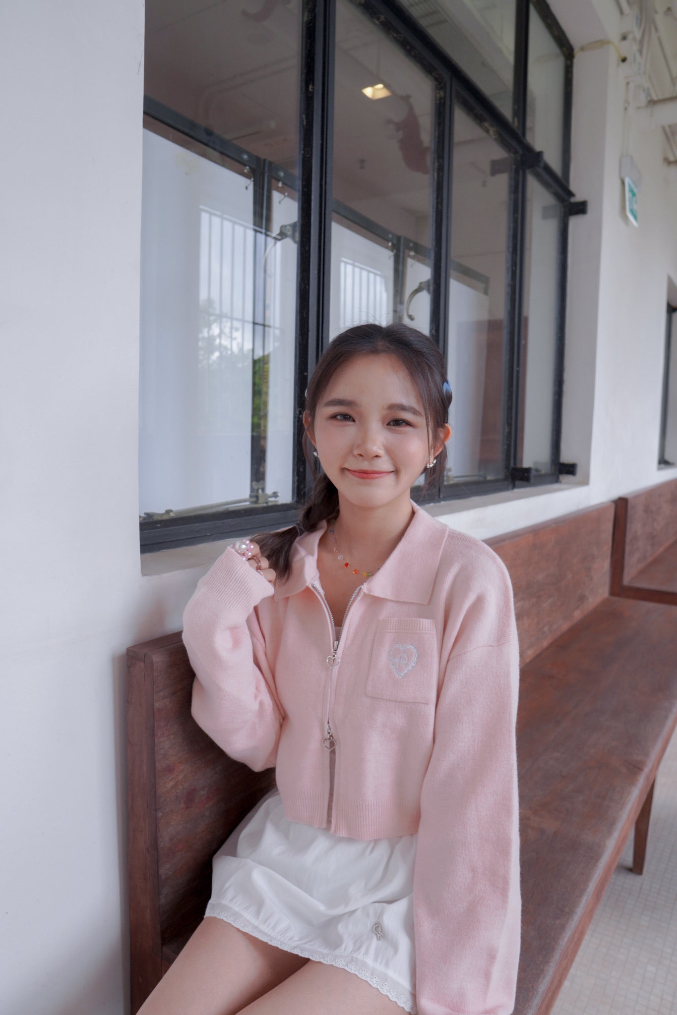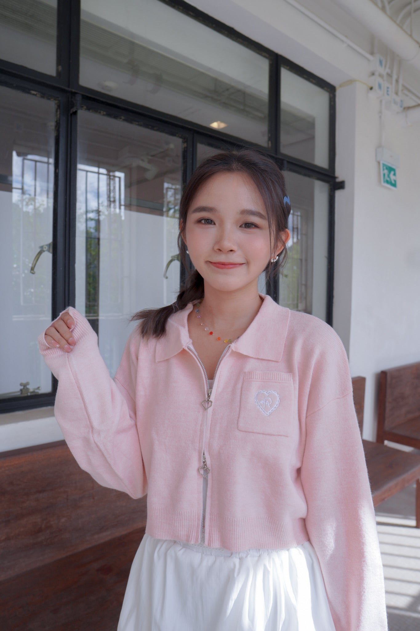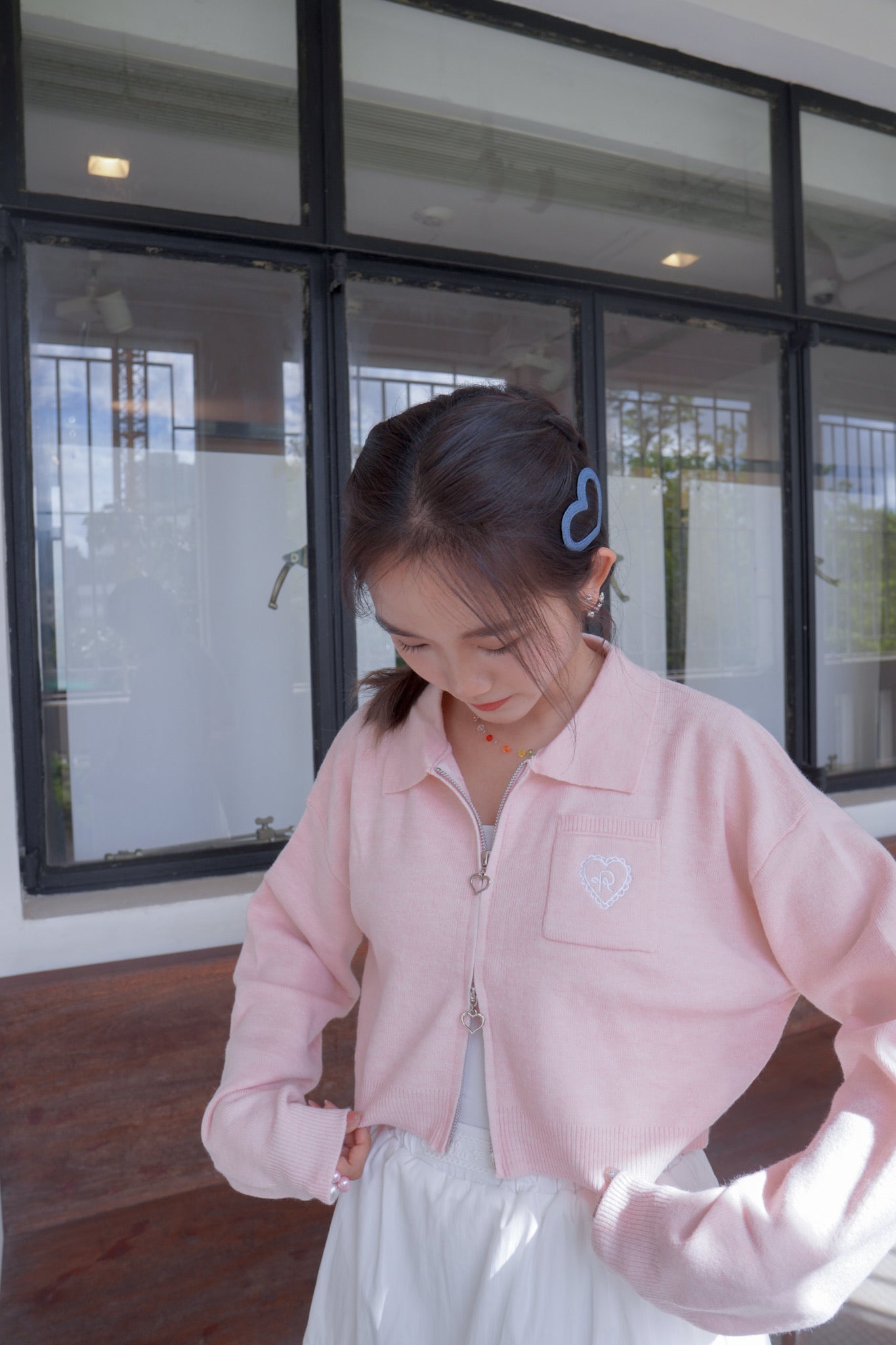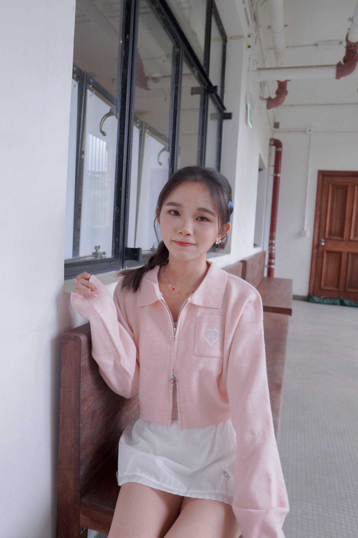 <現貨> 超可愛~馬卡龍愛心刺繡拉鍊口袋針織上衣|淺粉