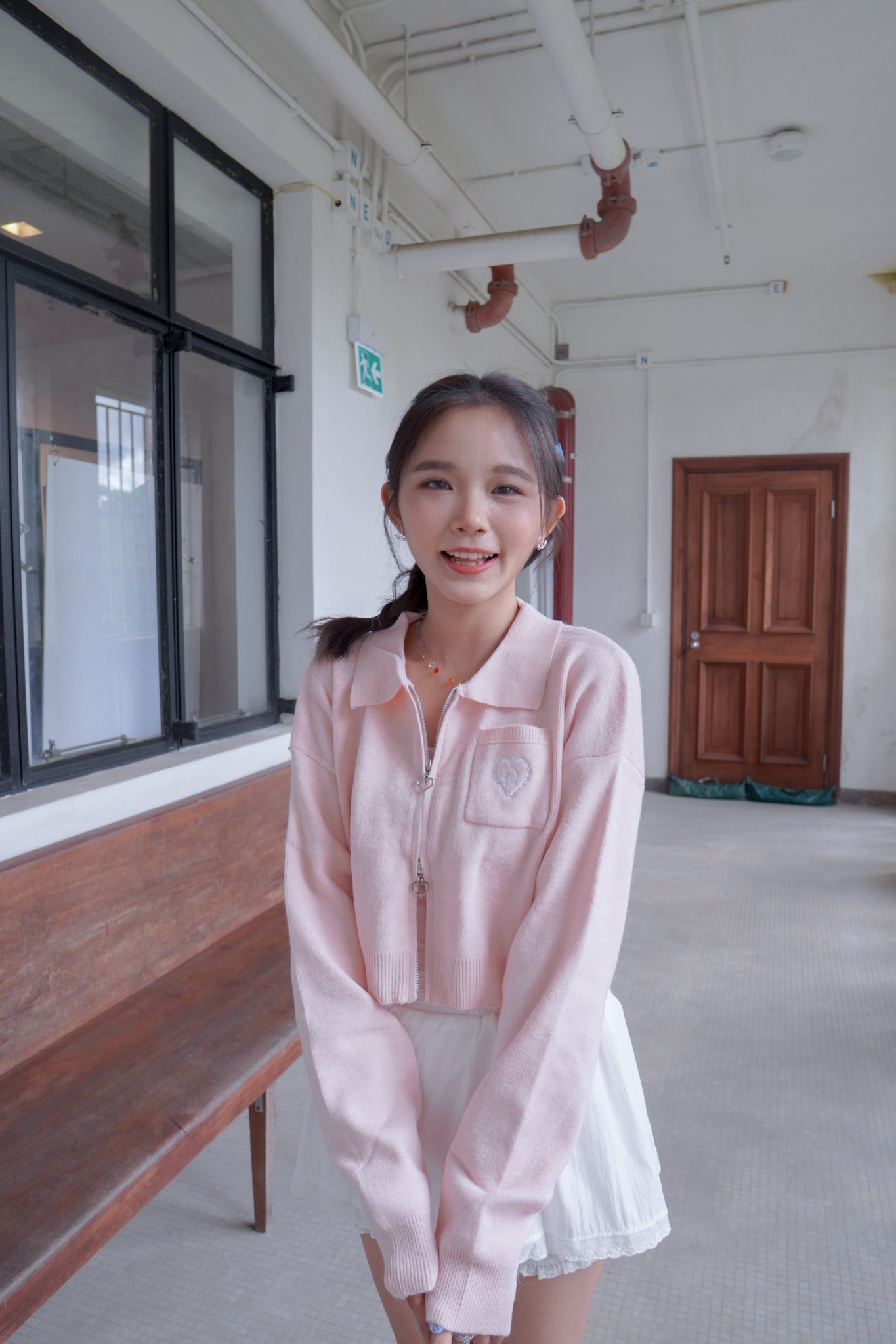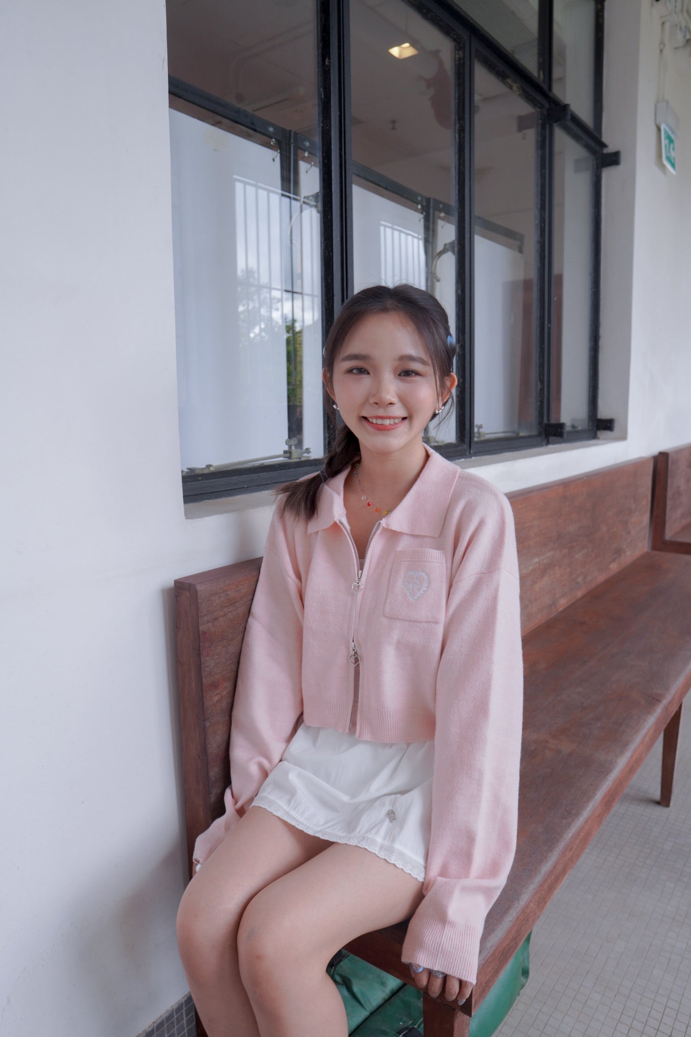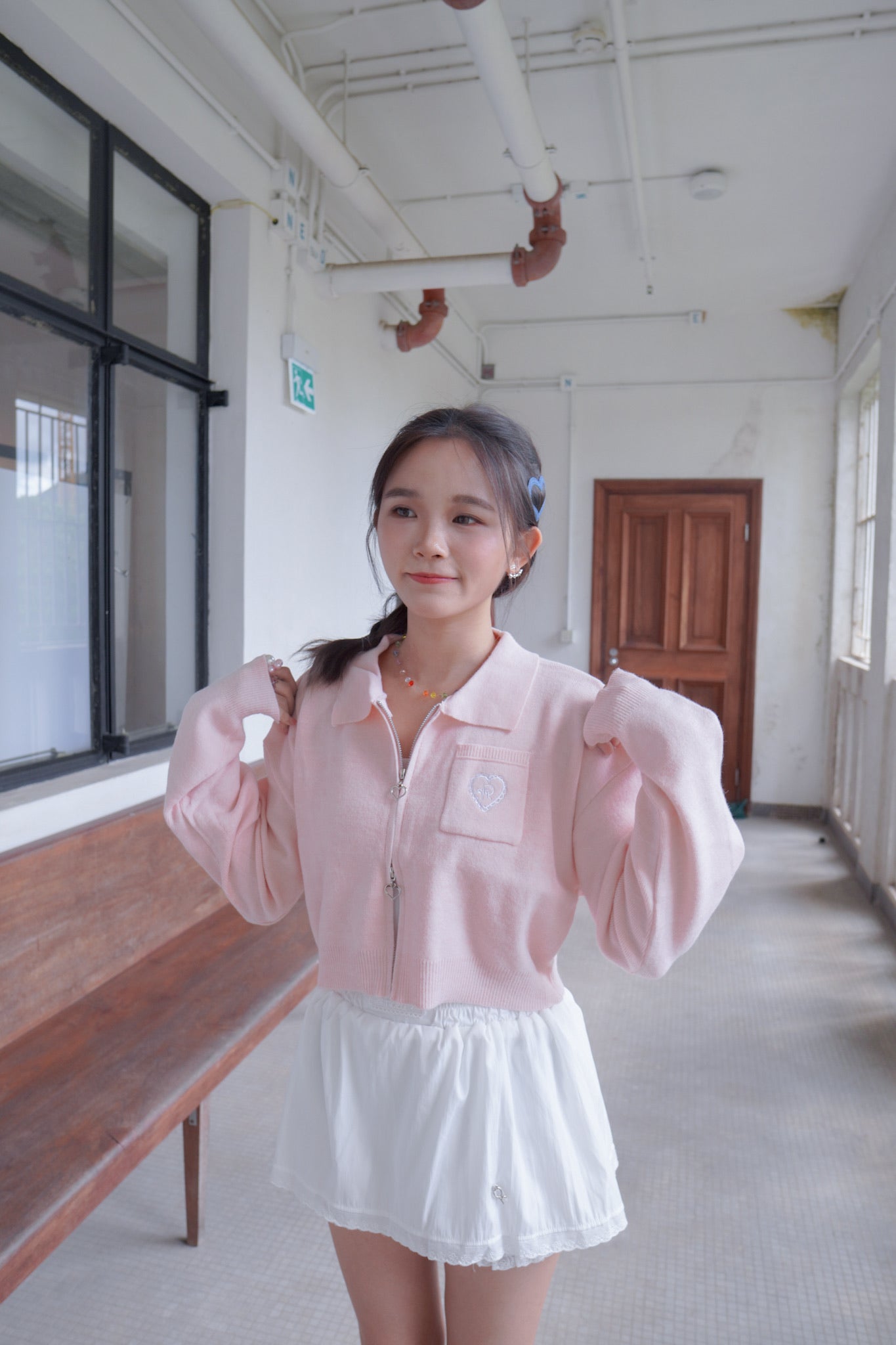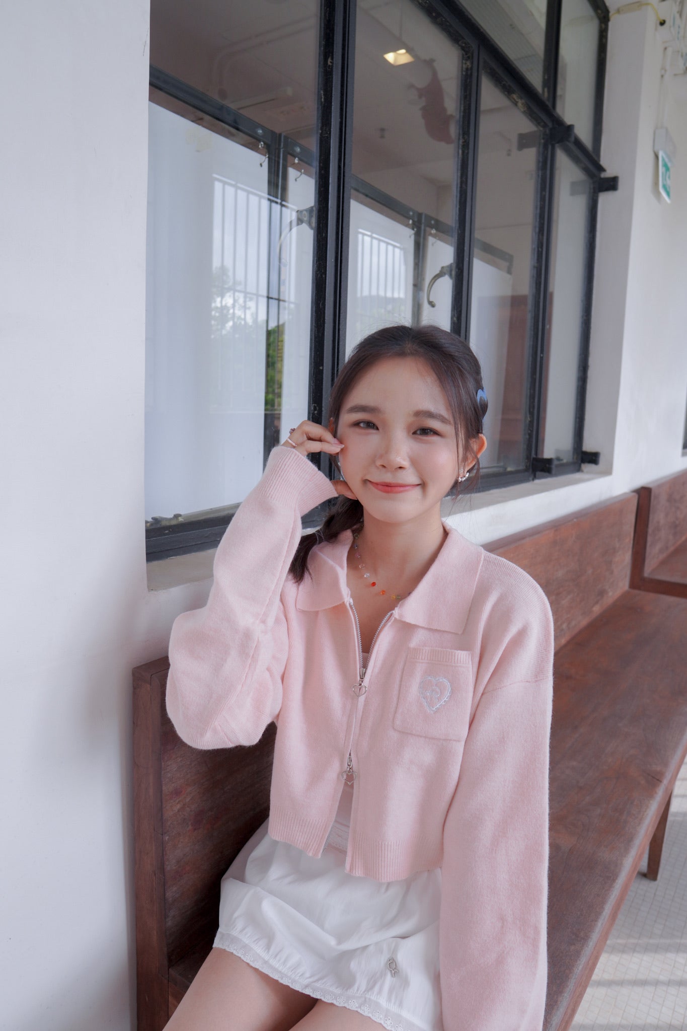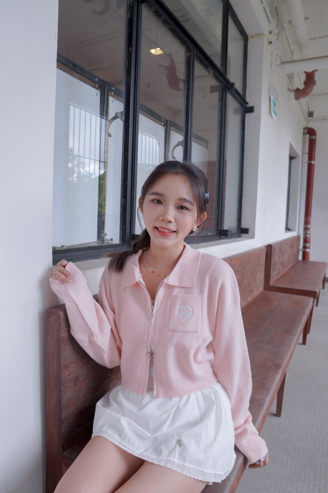 <現貨> 超可愛~馬卡龍愛心刺繡拉鍊口袋針織上衣|淺粉
