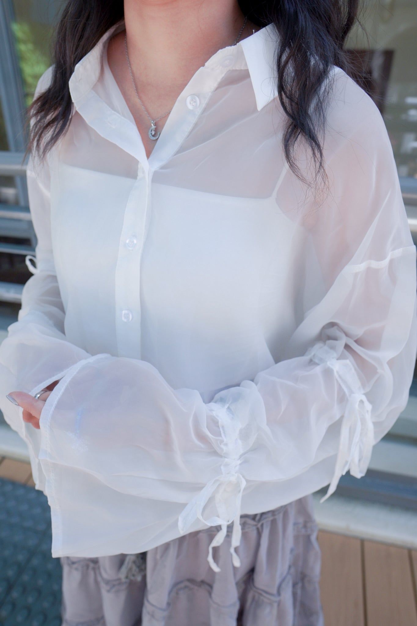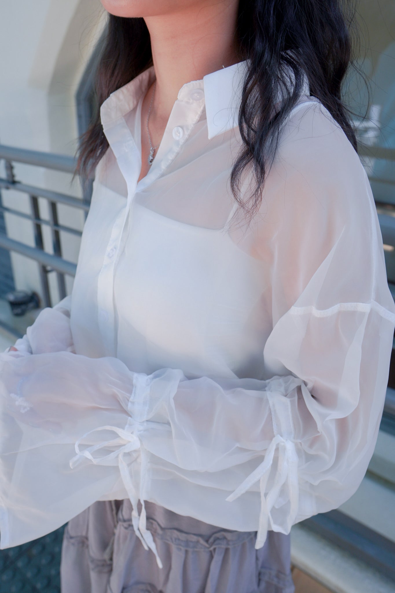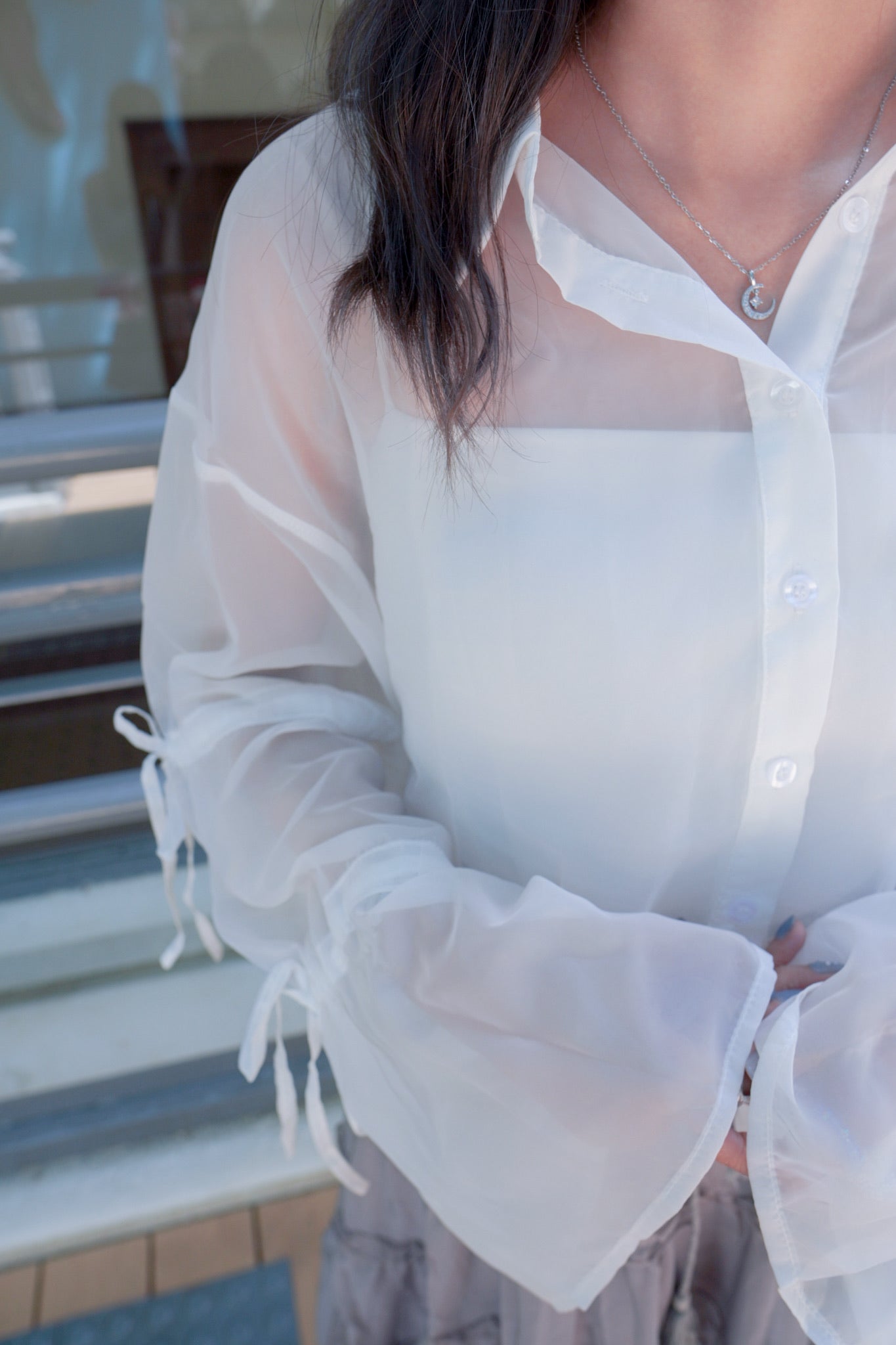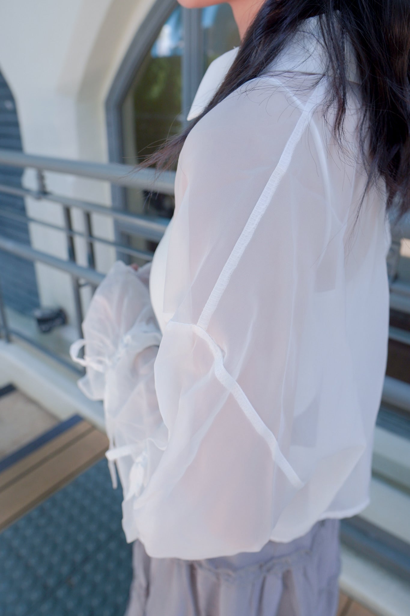 <預訂> 蝴蝶結綁帶短版開胸透透長袖裇衫