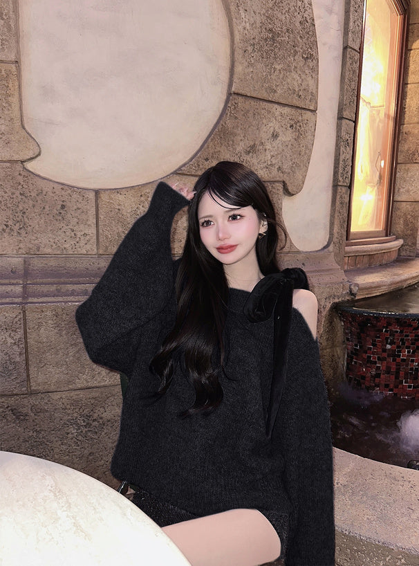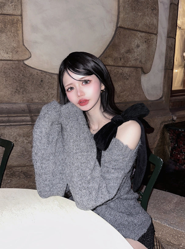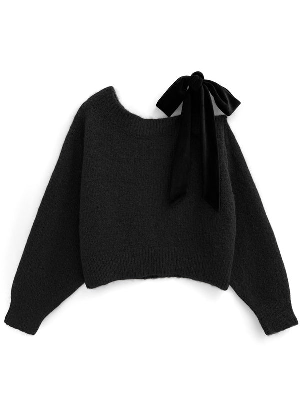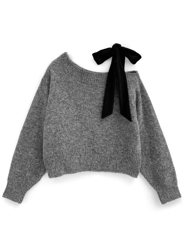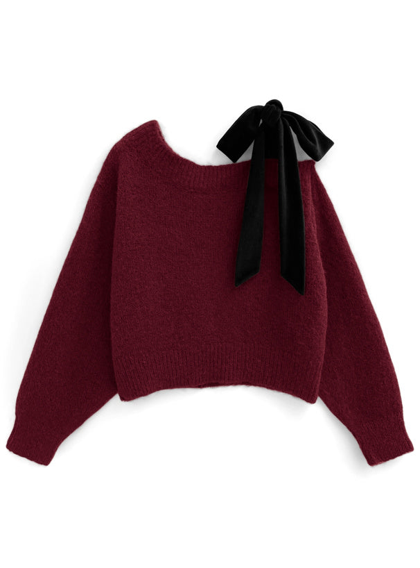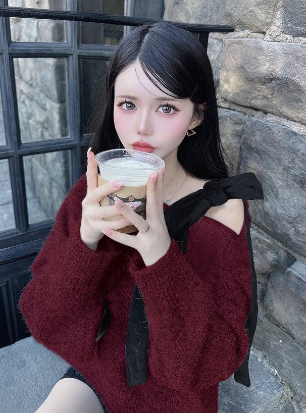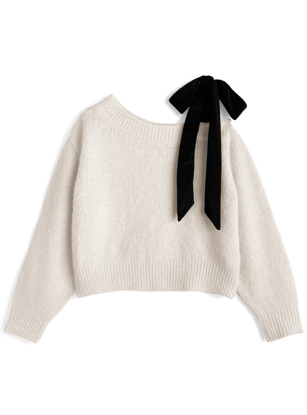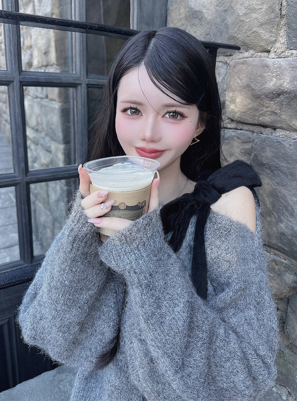 <預訂> 絲絨緞帶單肩針織上衣|四色入