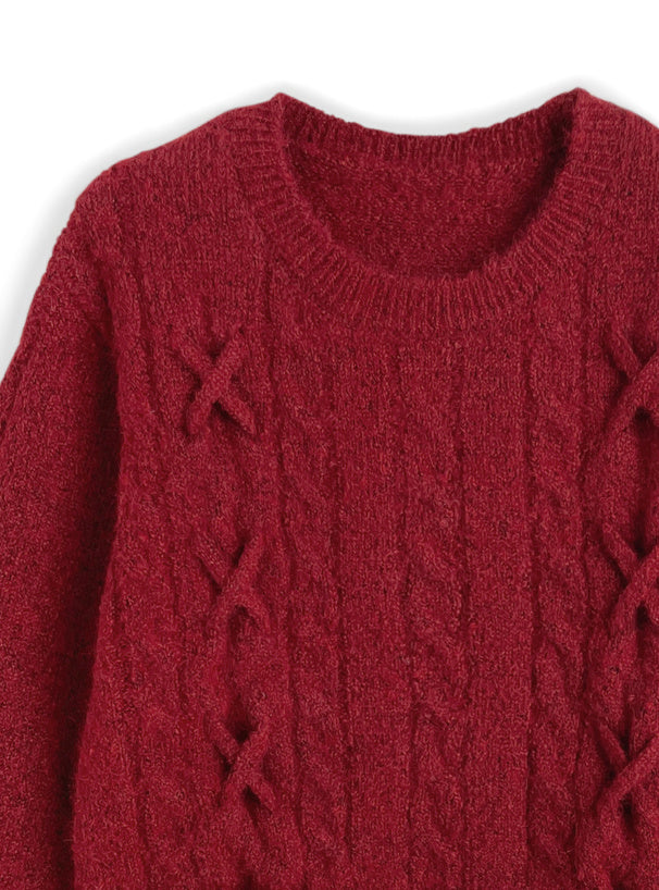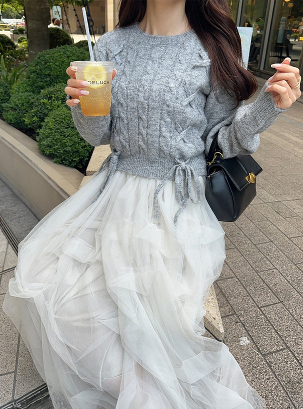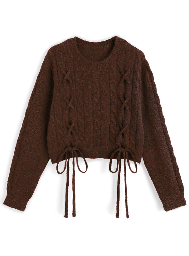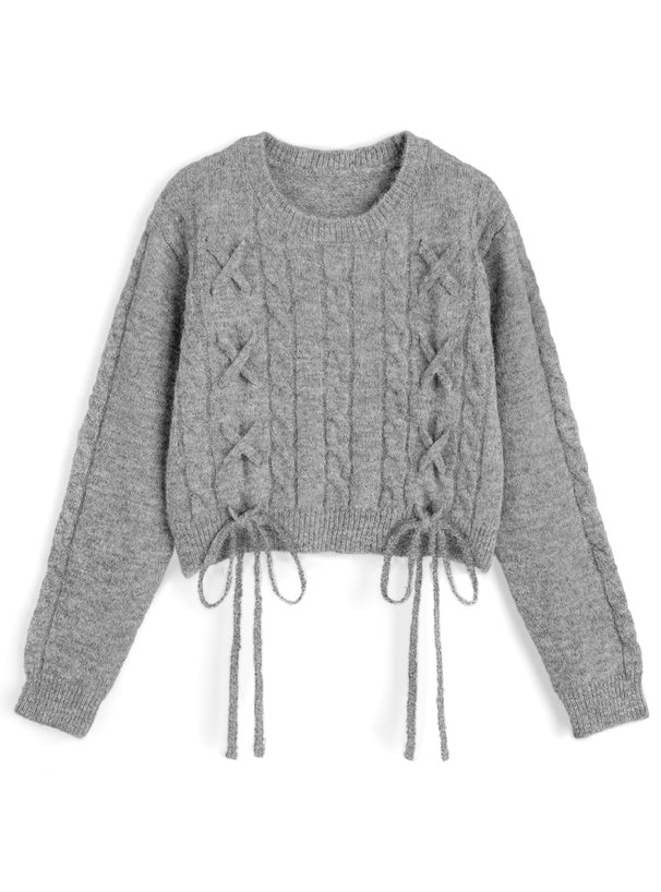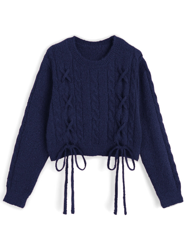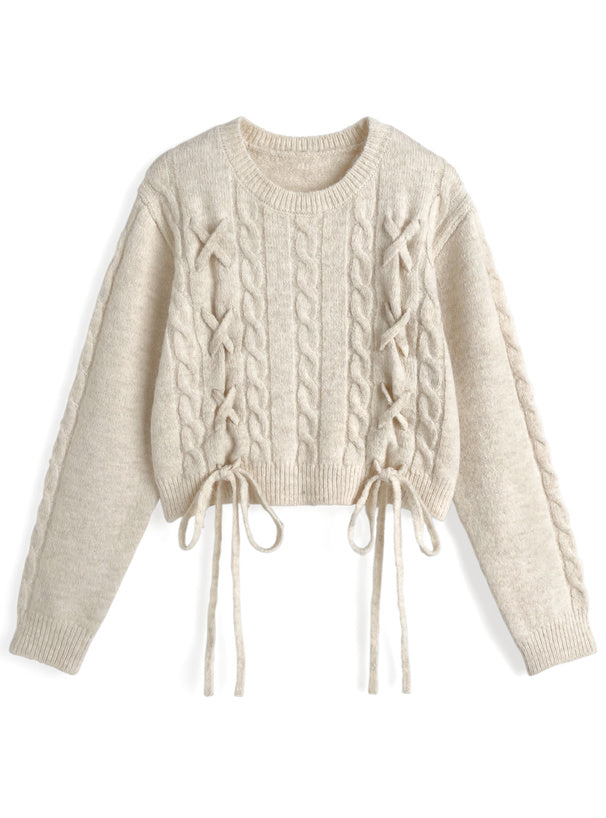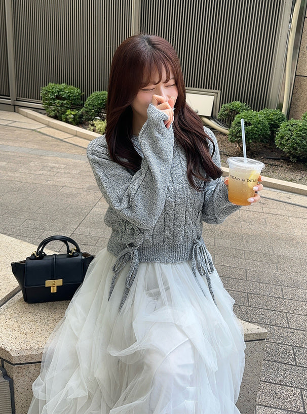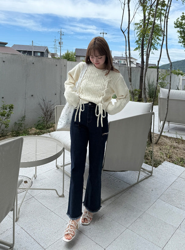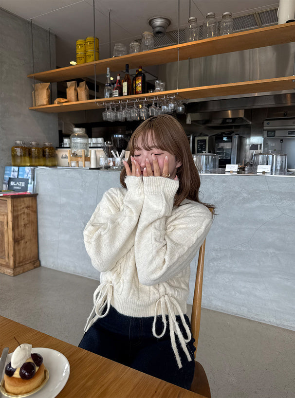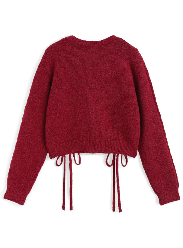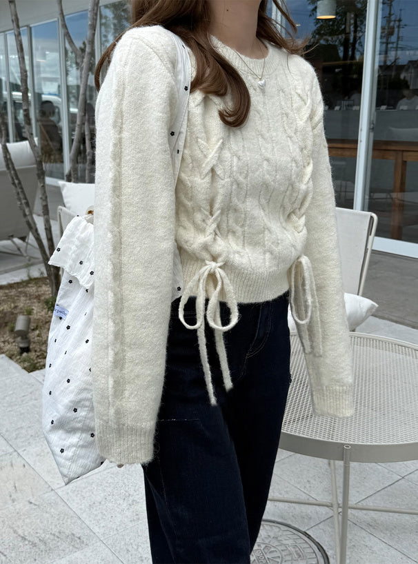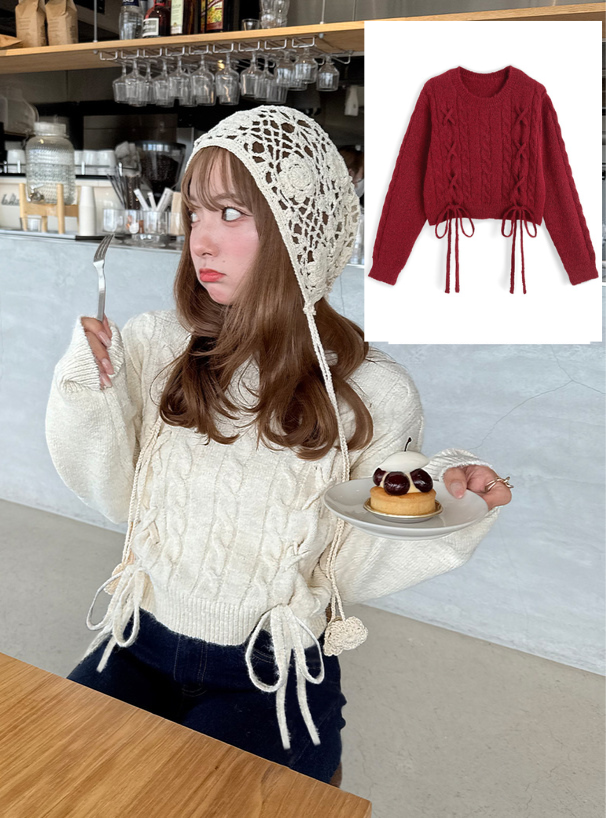 <預訂> 繫帶緞帶麻花針織上衣|五色入